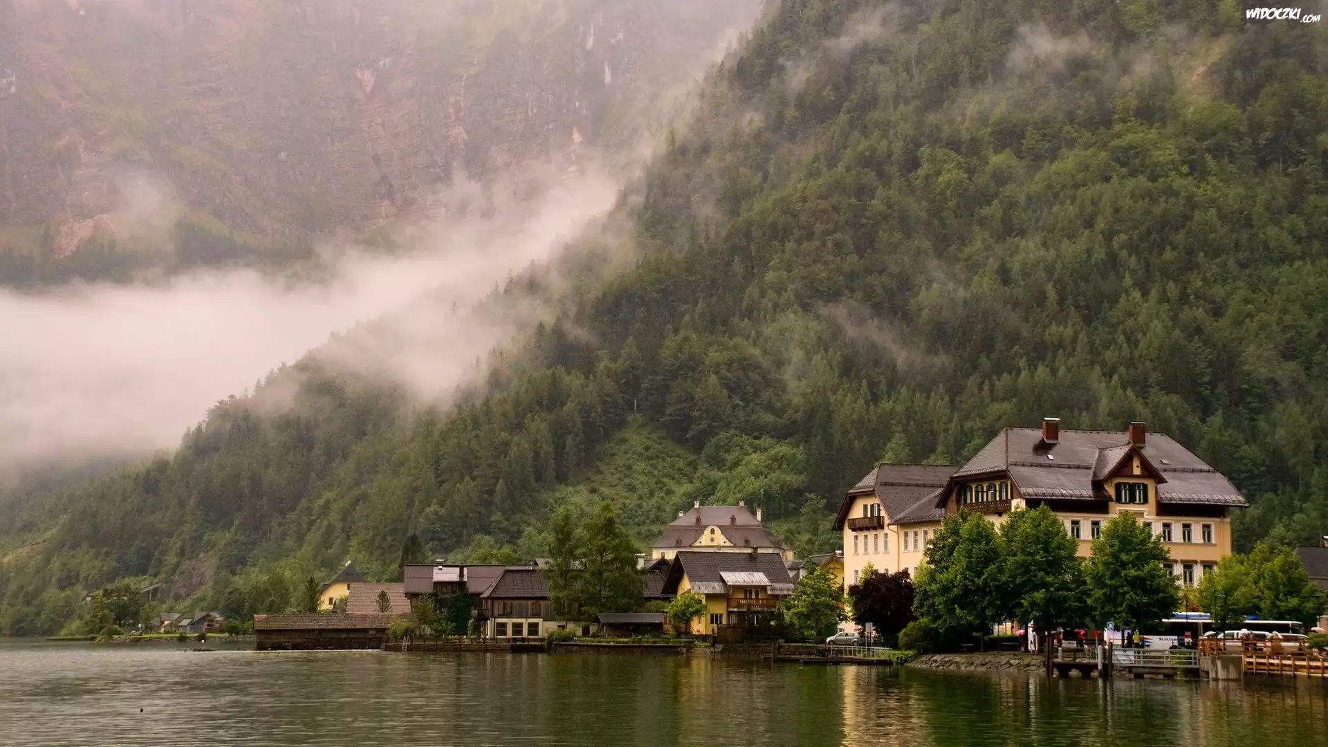 Zdjęcia, Jezioro, Las, Mgła, Domy, Hotele