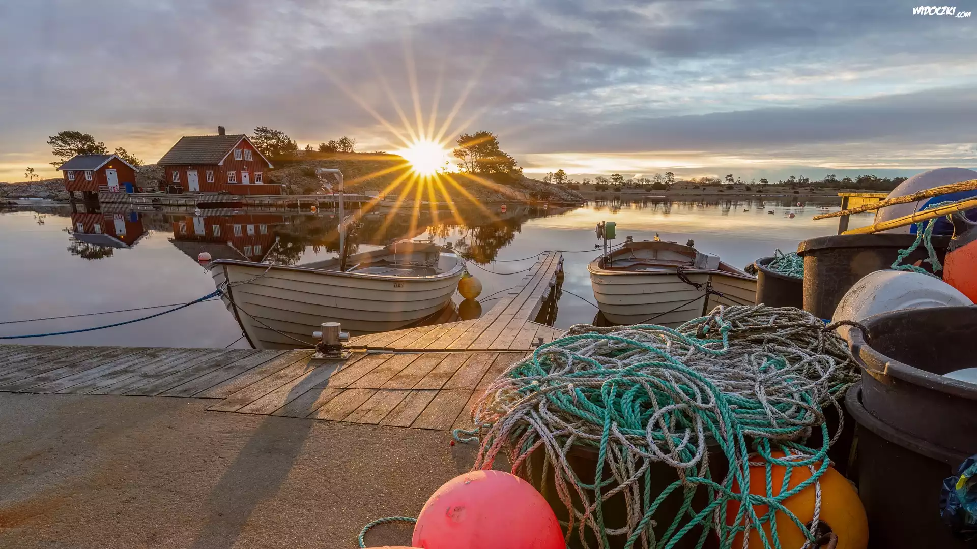 Promienie słońca, Domy, Jezioro, Łódki, Pomost, Sieć