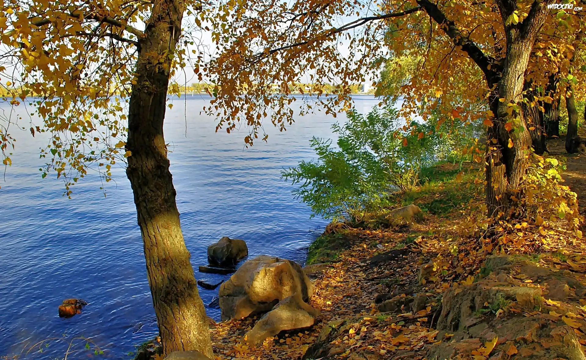Zdjęcia, Jezioro, Brzeg, Drzewa, Głazy