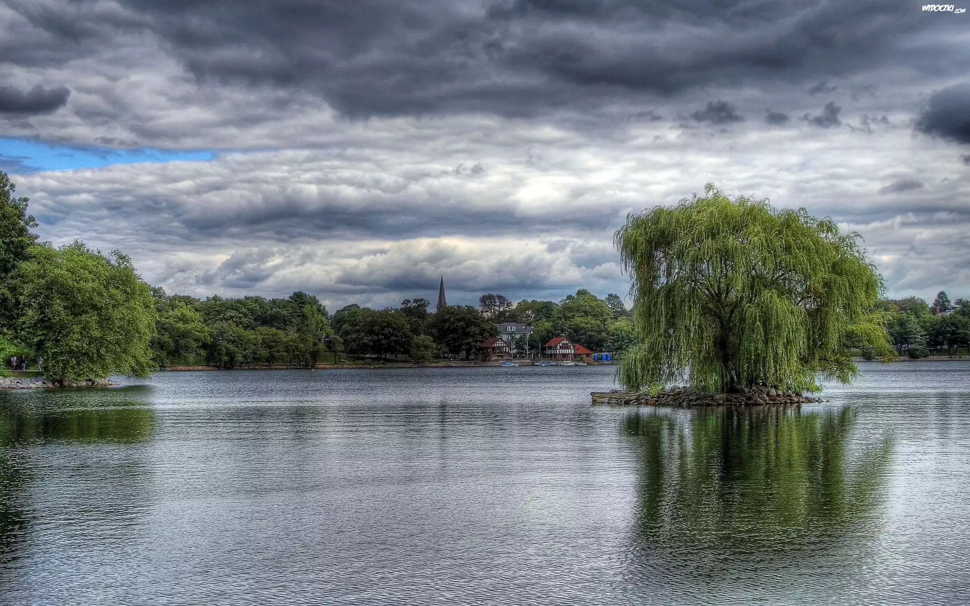 Zdjęcia, Jezioro, Chmury, Drzewa, Budynki
