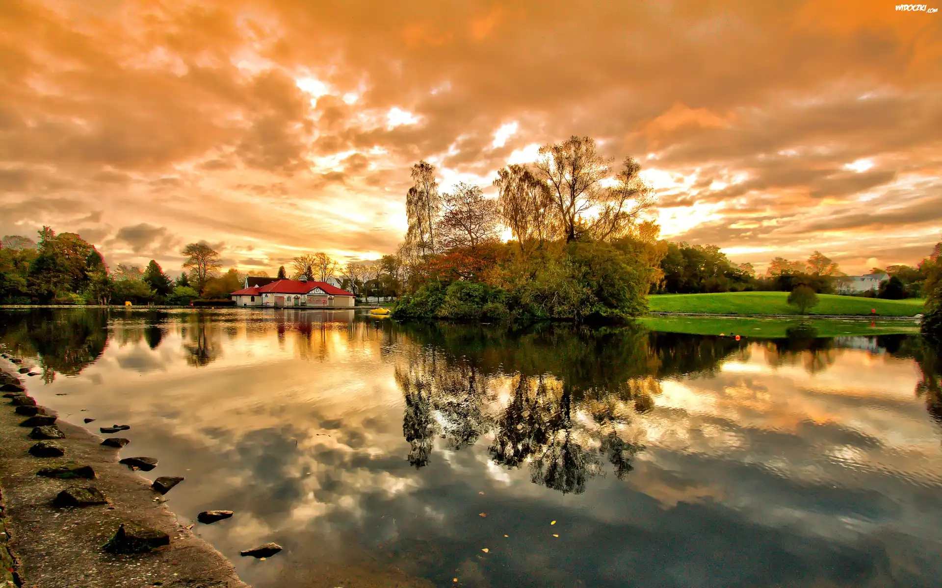 Zdj臋cia, Jezioro, Chmury, Drzewa, Dom