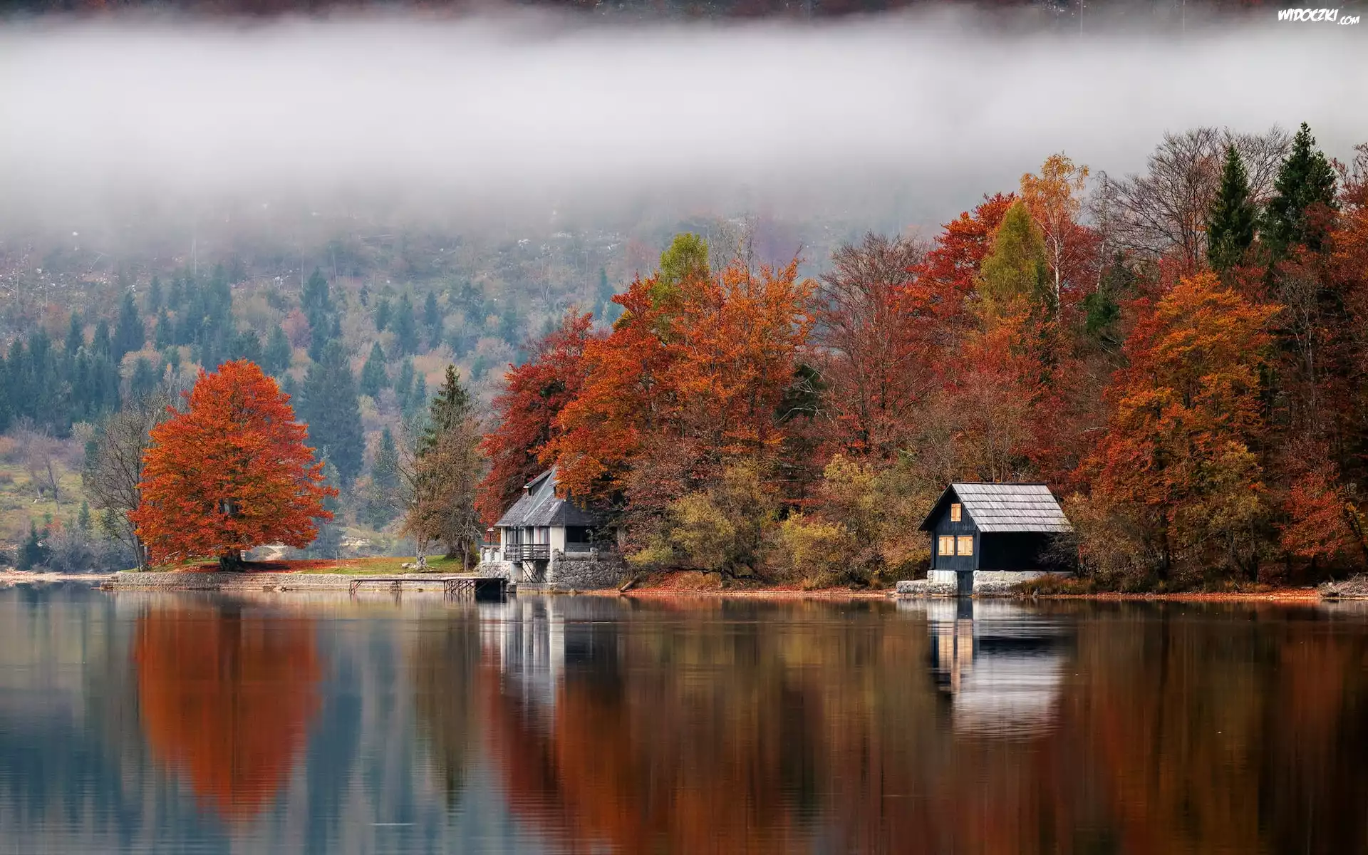 Zdjęcia, Jezioro, Jesień, Domy, Drzewa, Mgła