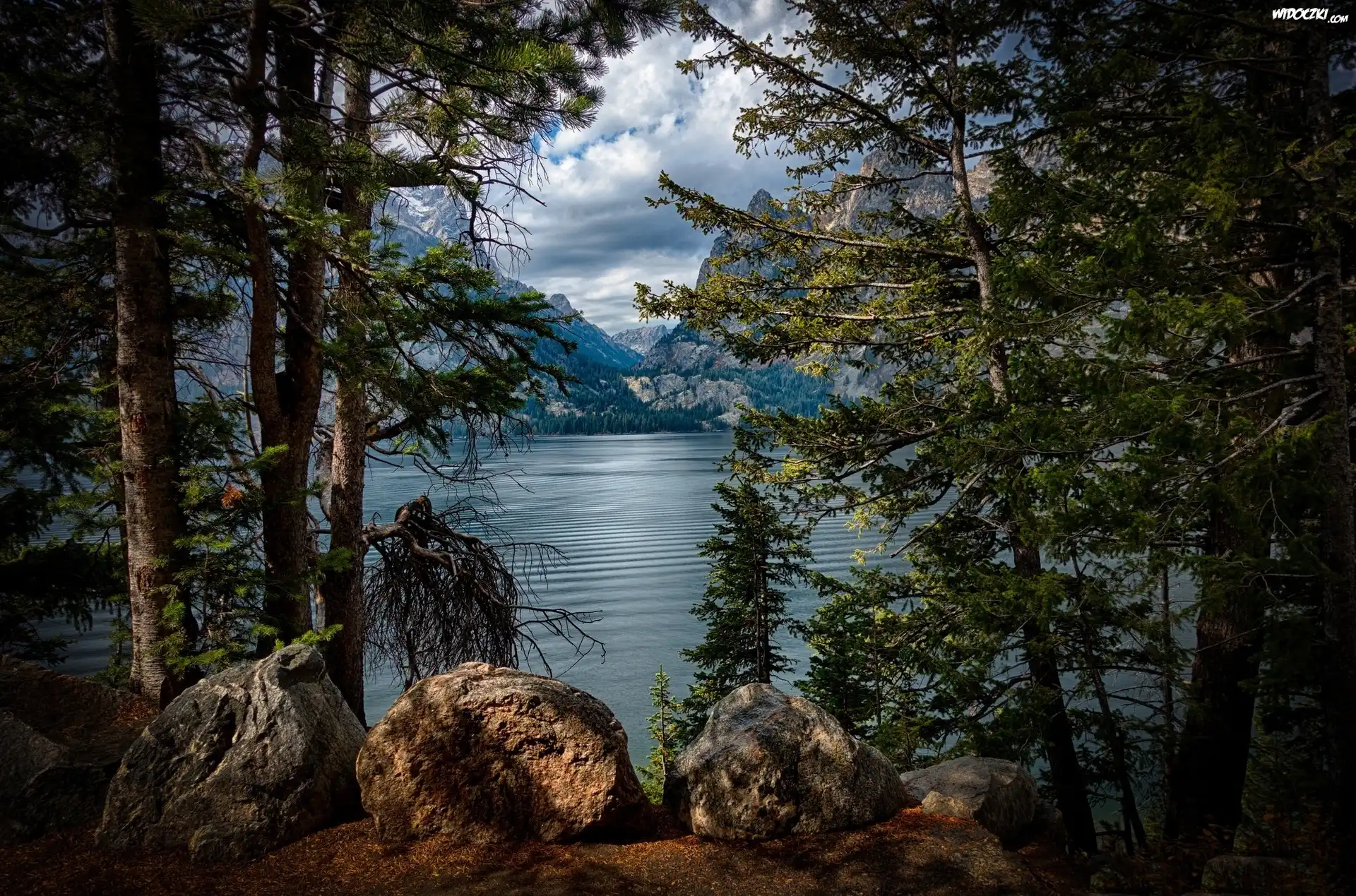 Zdjęcia, Jezioro, Głazy, Drzewa, Góry