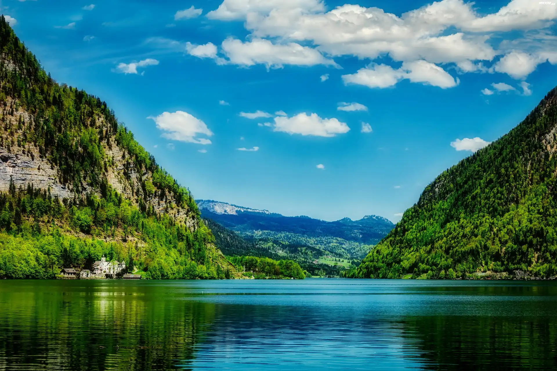 Jezioro, Góry, Drzewa, Domy