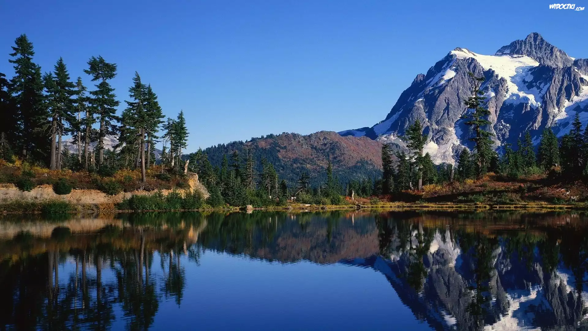 Zdjęcia, Jezioro, Ośnieżone, Góry, Drzewa, Iglaki