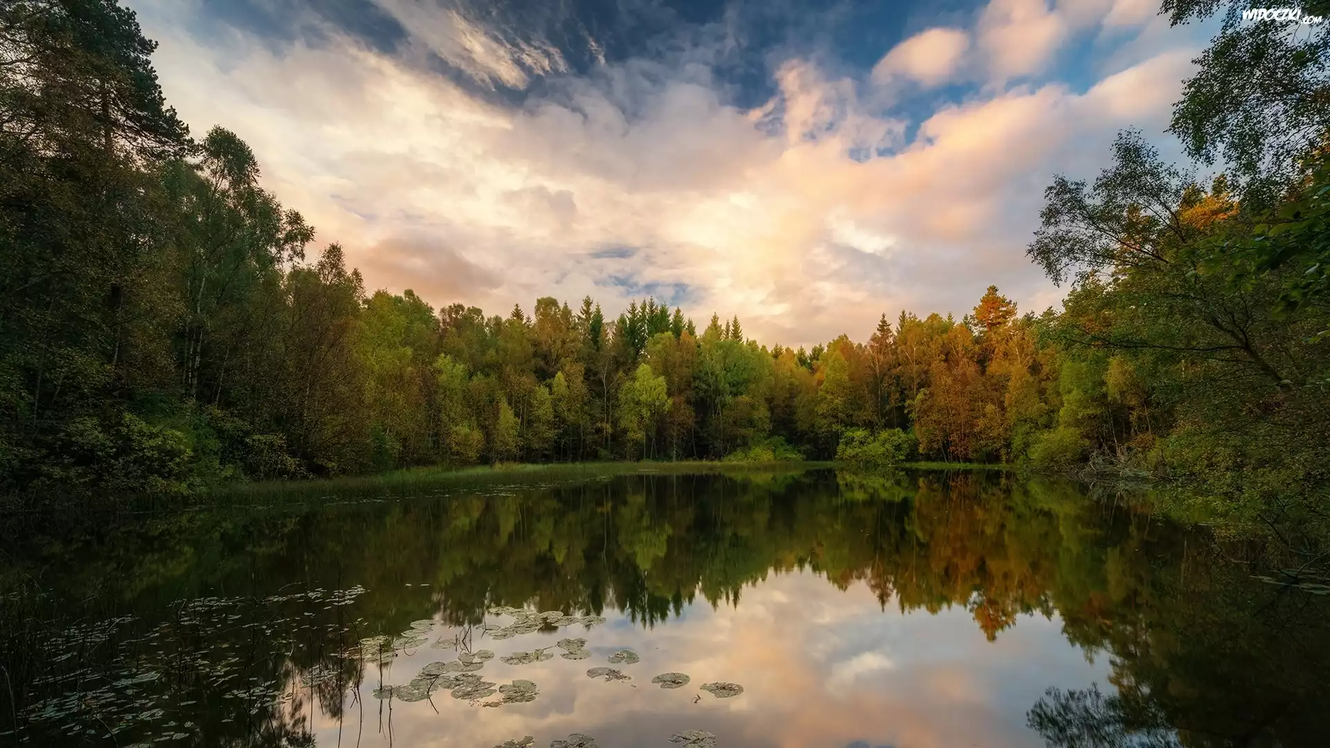 Zdjęcia, Jezioro, Zielony, Las, Drzewa, Chmury