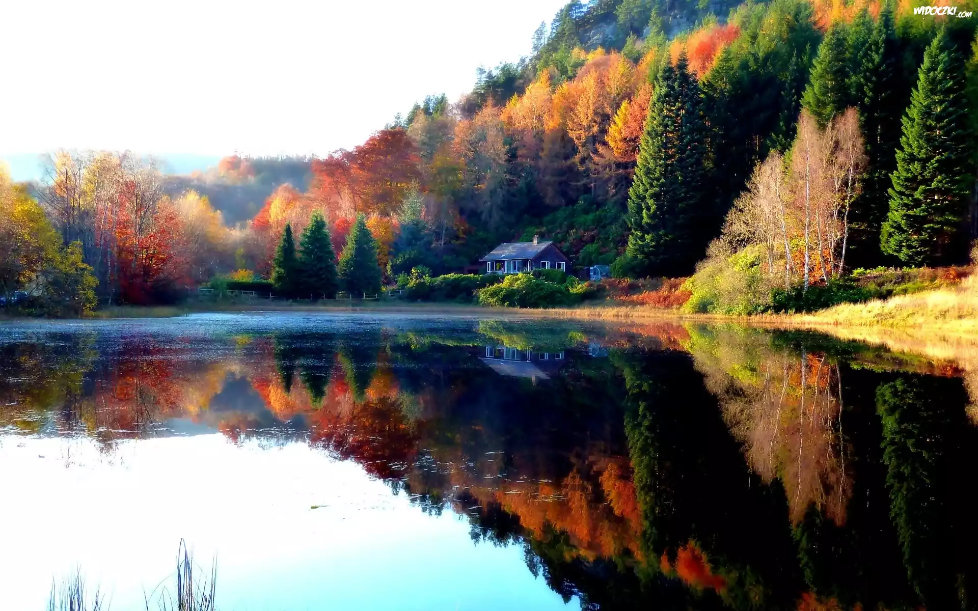 Jezioro, Dom, Lasy, Kolorowe, Drzewa, Jesień
