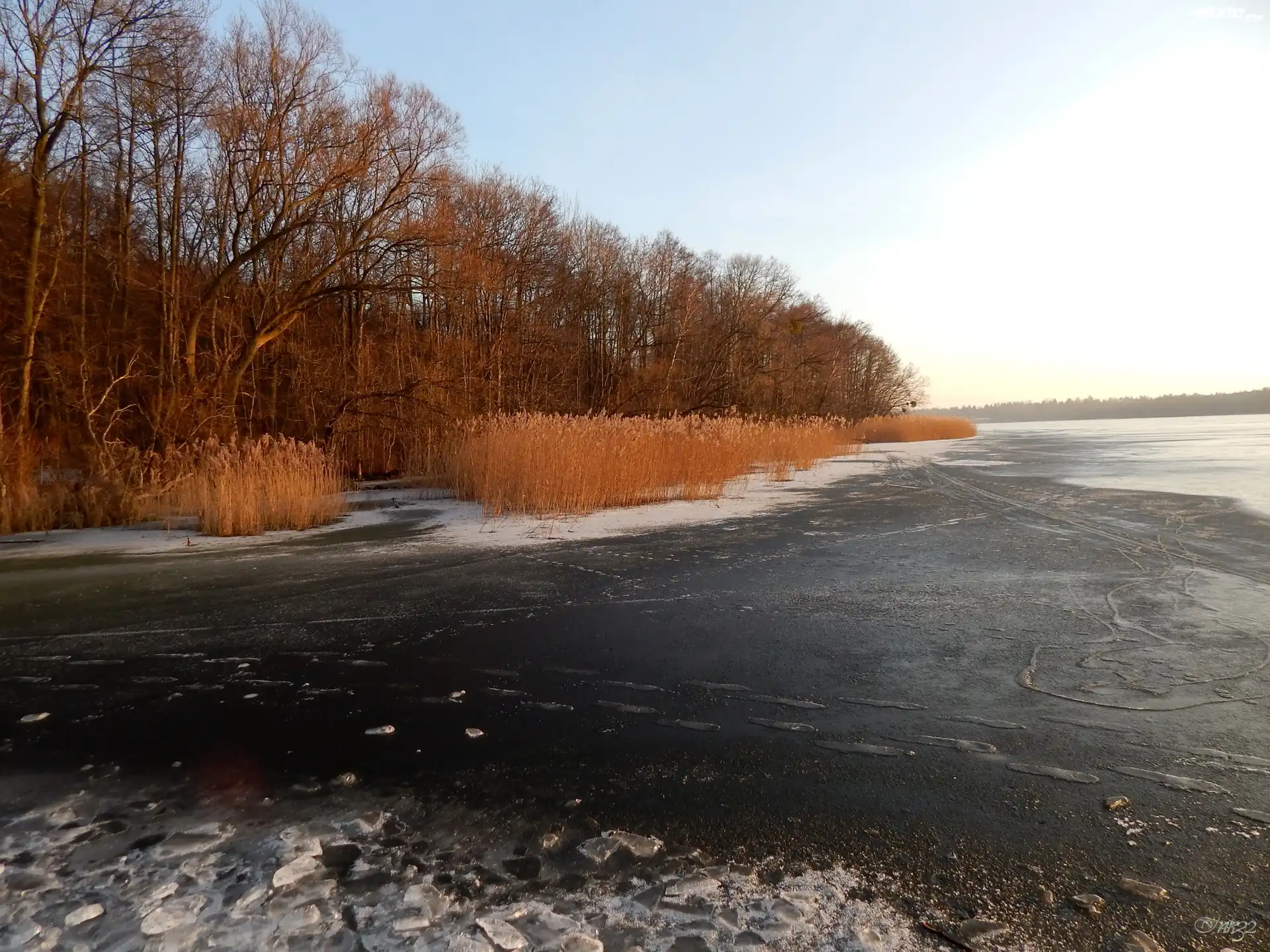 Zdjęcia, Jezioro, Lód, Drzewa, Trzcina