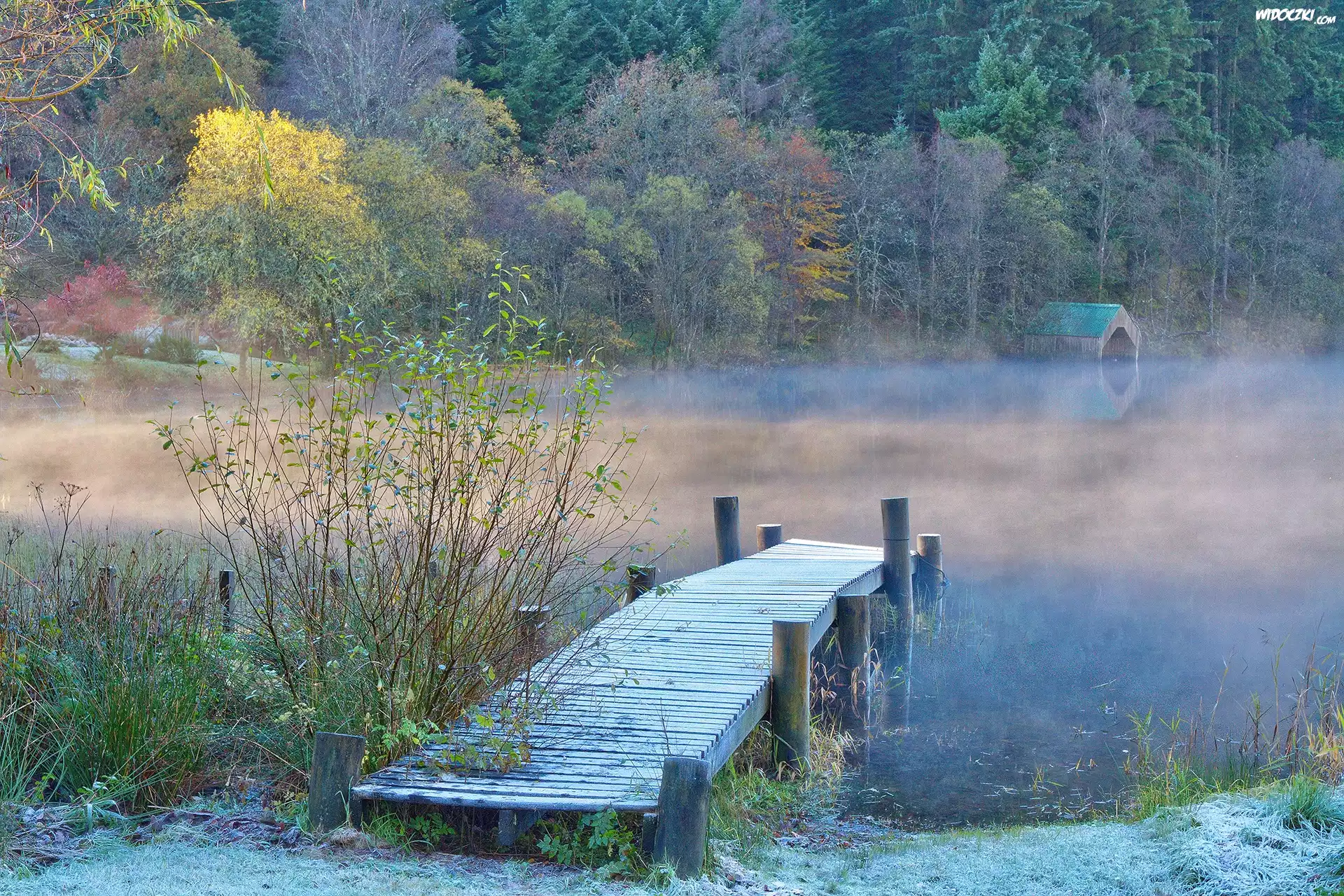 Zdjęcia, Jezioro, Mgła, Drzewa, Pomost