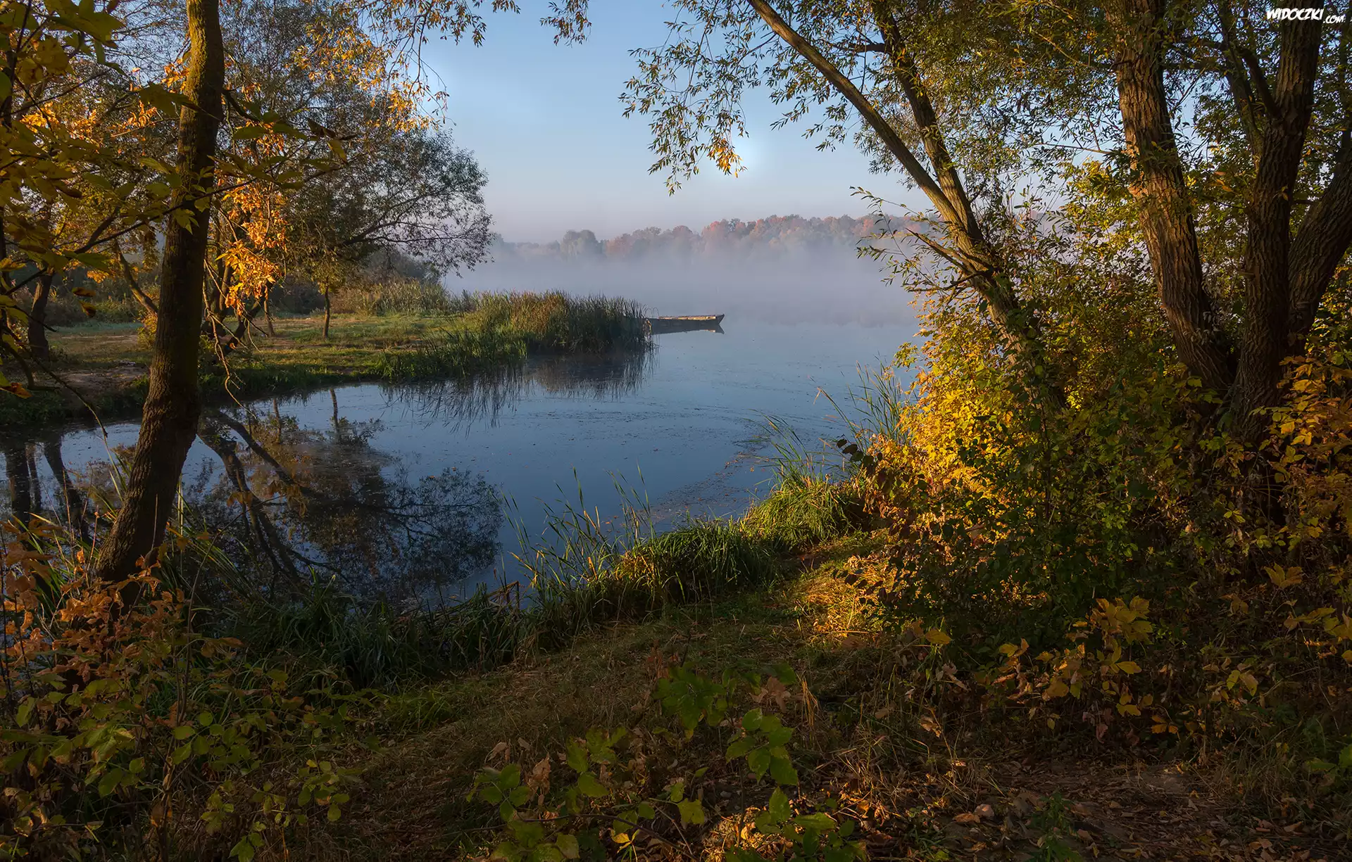 Zdjęcia, Jezioro, Mgła, Drzewa, Rośliny