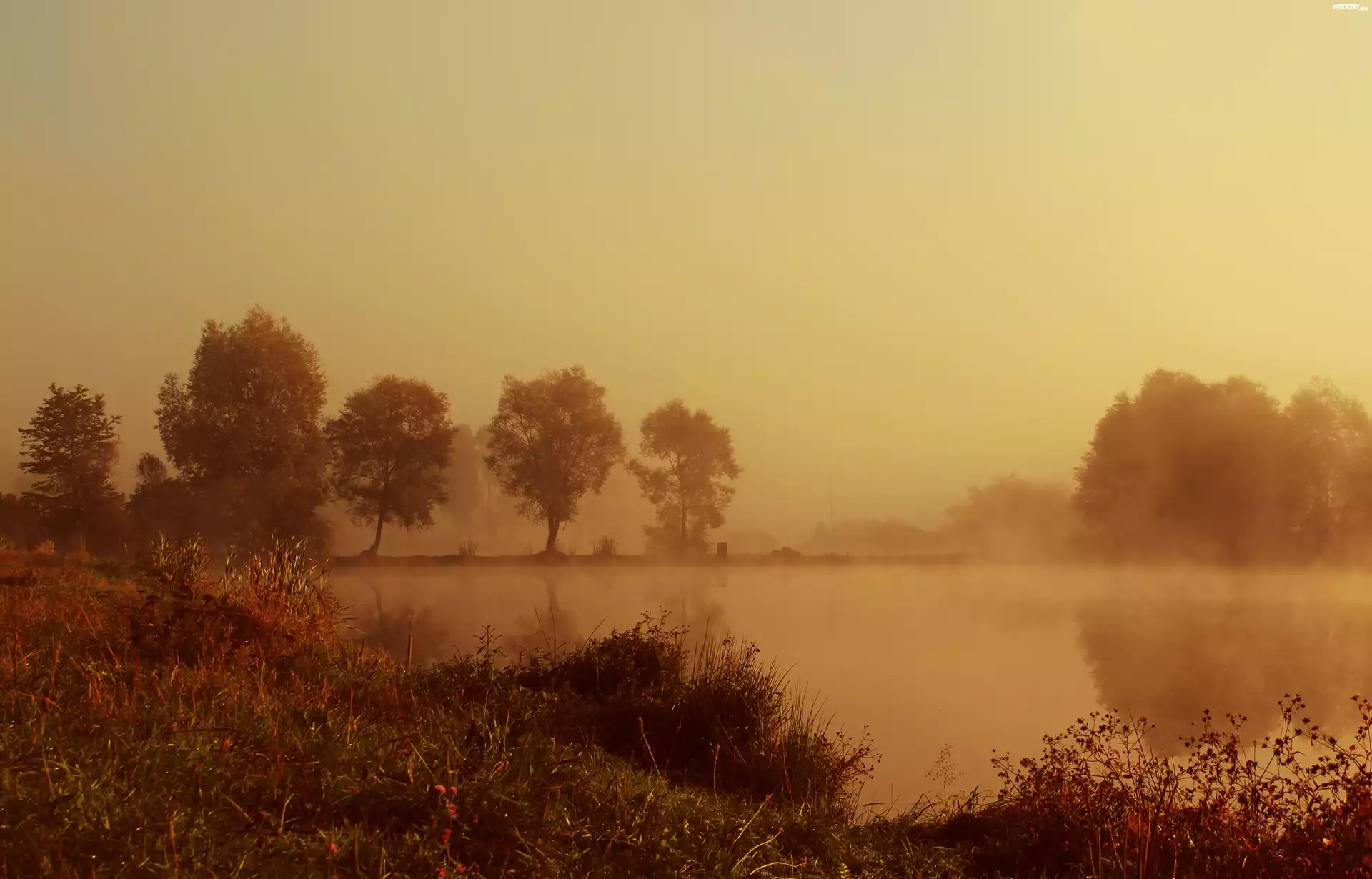 Jezioro, Świt, Mgła, Drzewa, Jesień