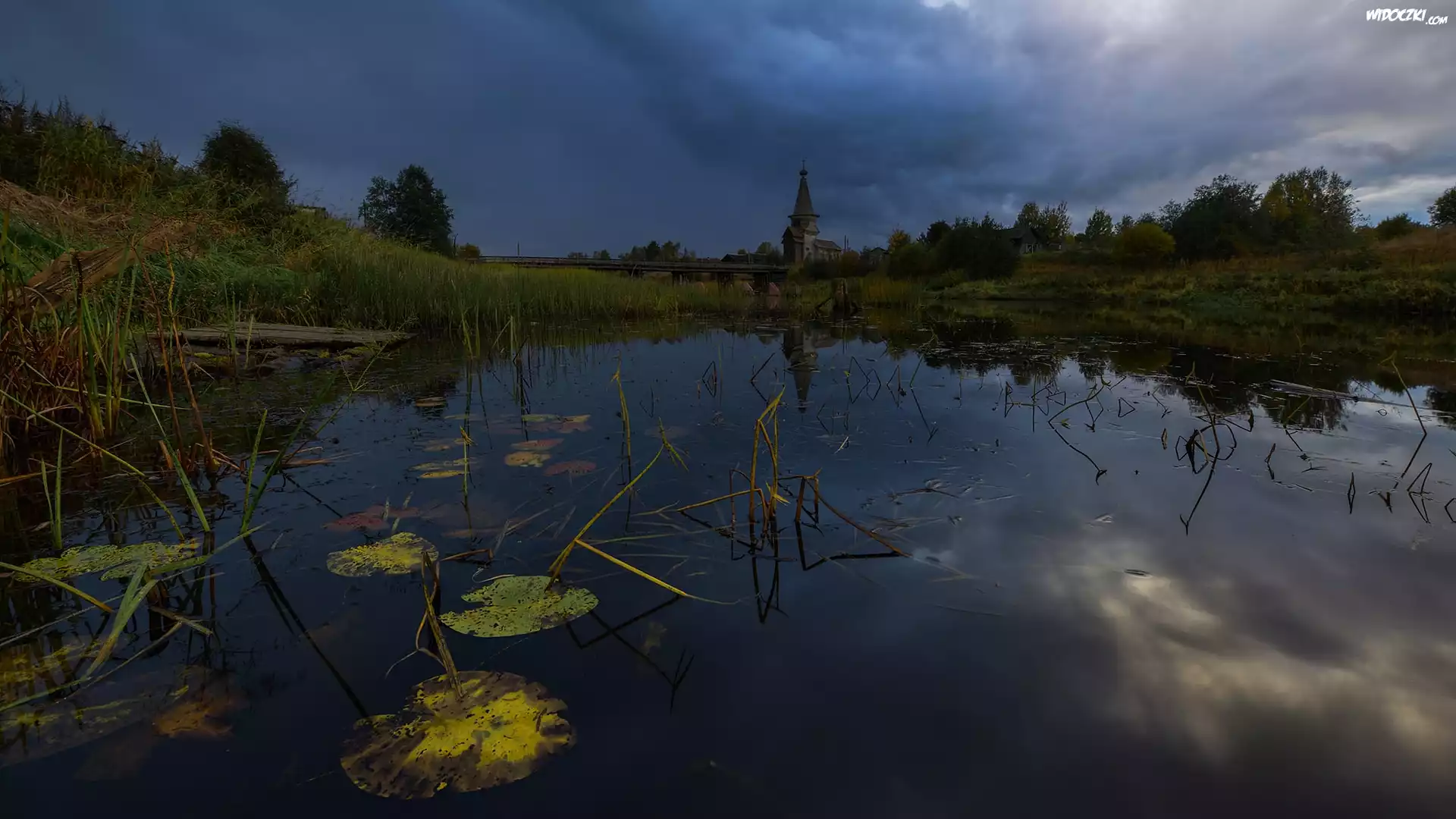 Zdj臋cia, Cerkiew, Jezioro, Drzewa, Zachmurzone, Niebo