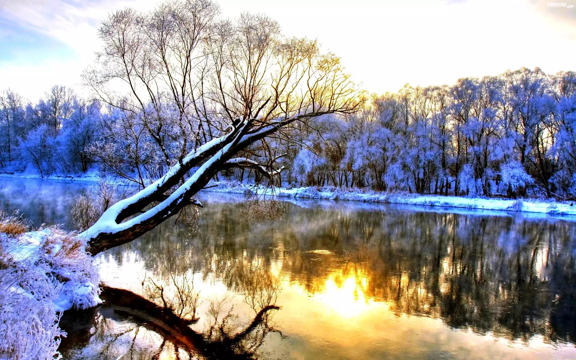 Zdjęcia, Drzewa, Jezioro, Śnieg
