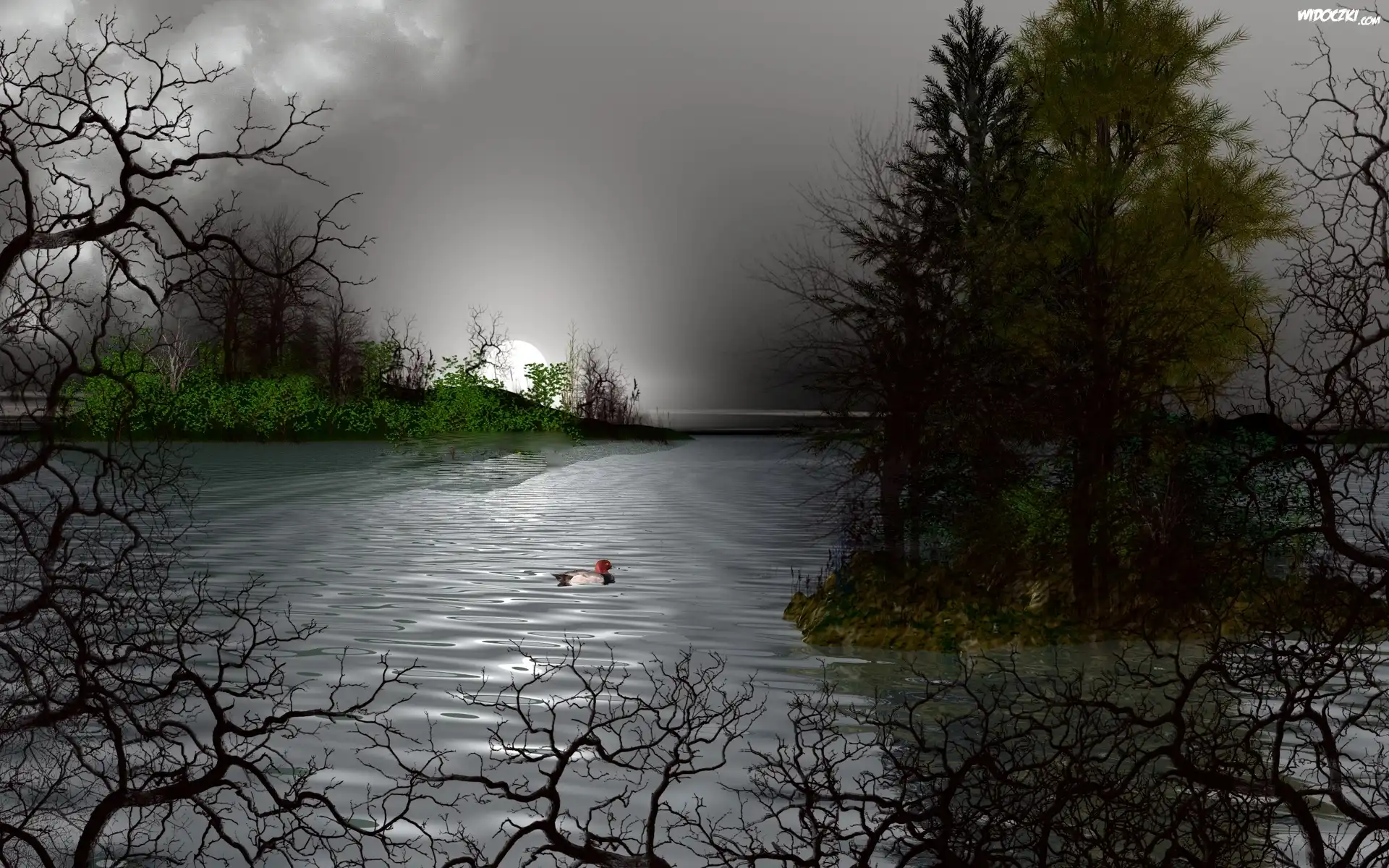Zdjęcia, Jezioro, Noc, Drzewa, Kaczka