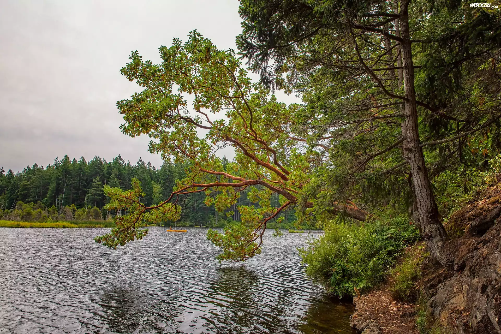 Zdjęcia, Jezioro, Łódka, Drzewa, Las