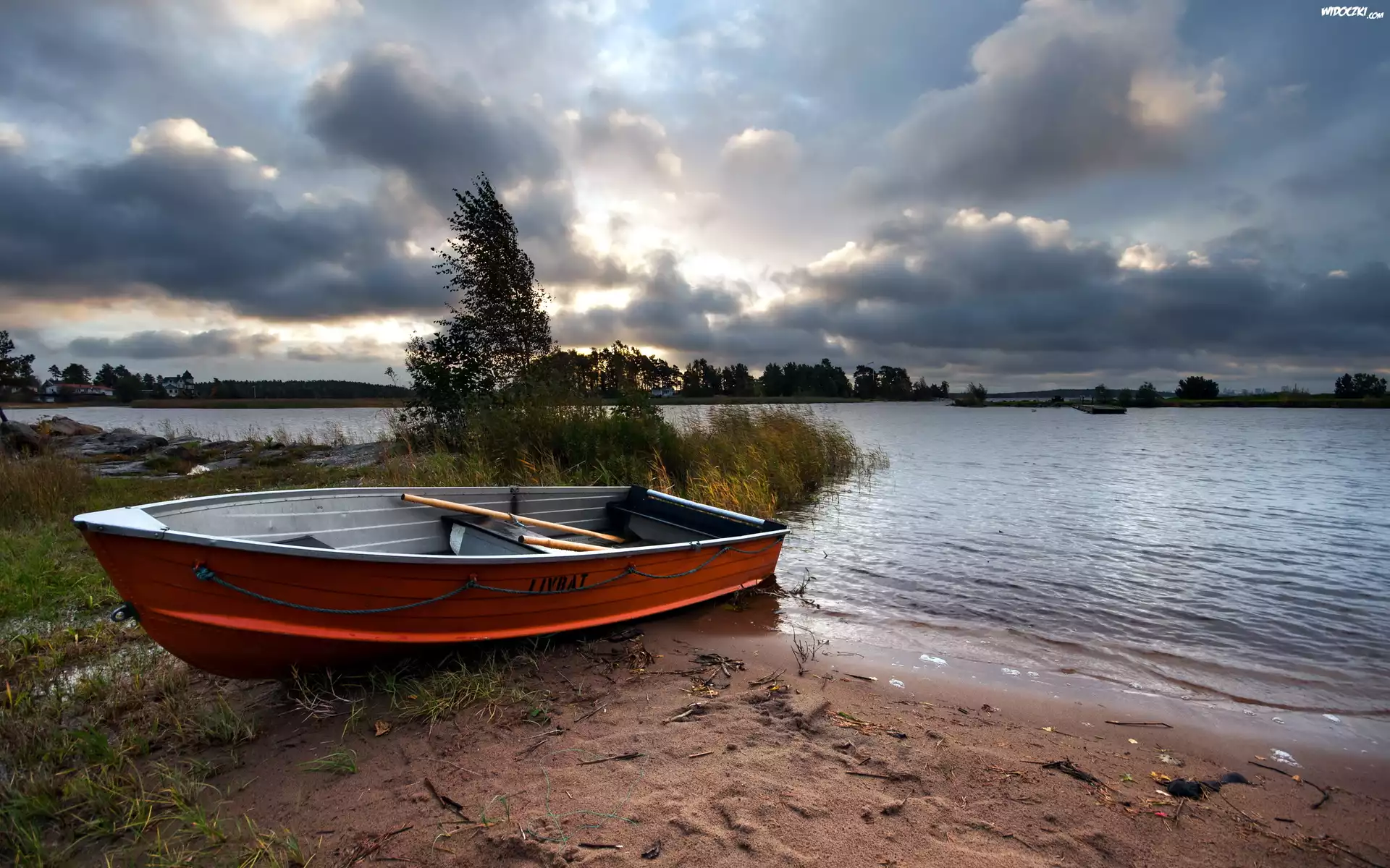 Zdjęcia, Jezioro, Łódz, Drzewa, Trawy