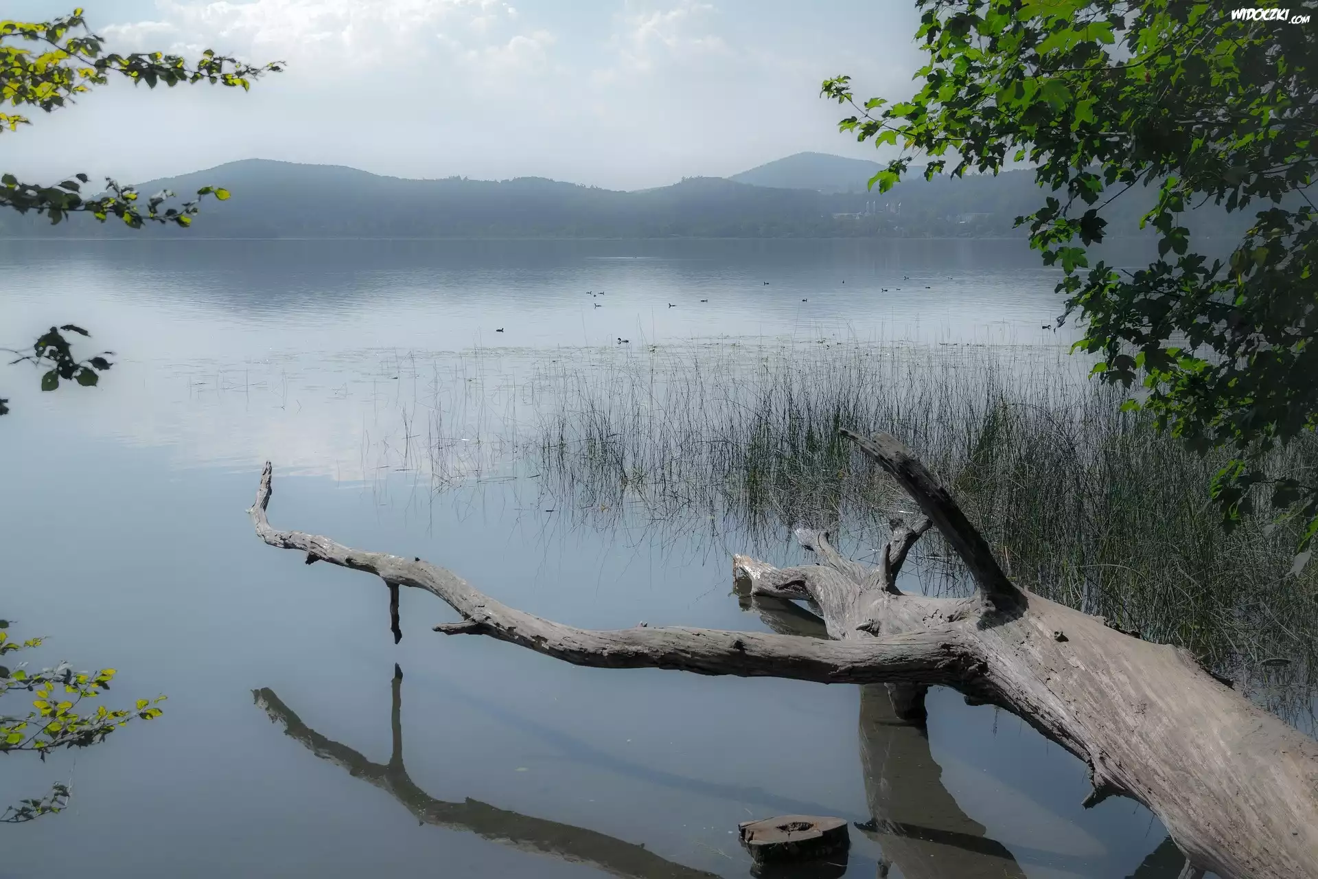 Zdjęcia, Jezioro, Zarośla, Pień, Drzewa, Mgła
