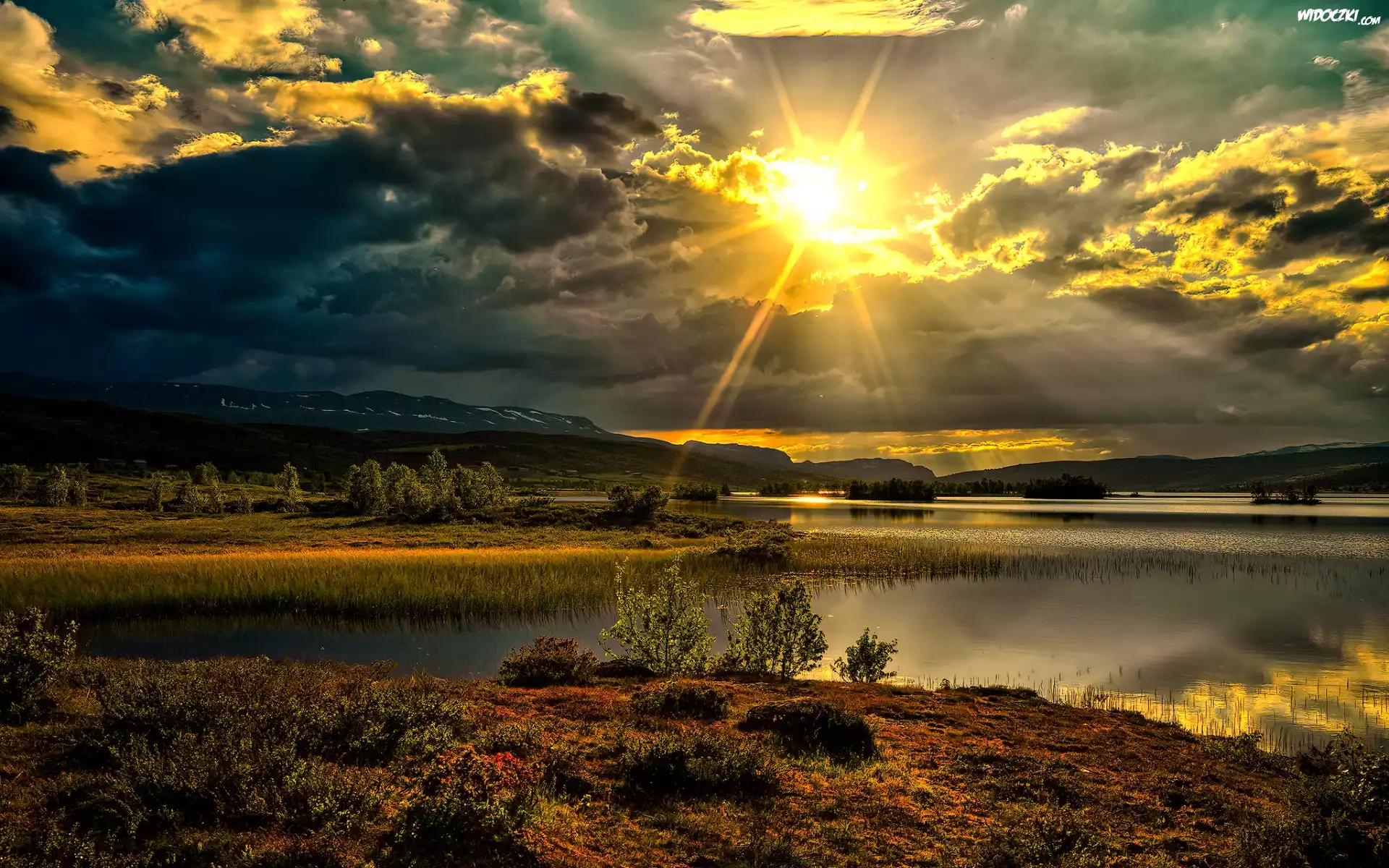 Zdjęcia, Jezioro, Wschód Słońca, Chmury, Góry, Rośliny, Drzewa, Valdres, Norwegia