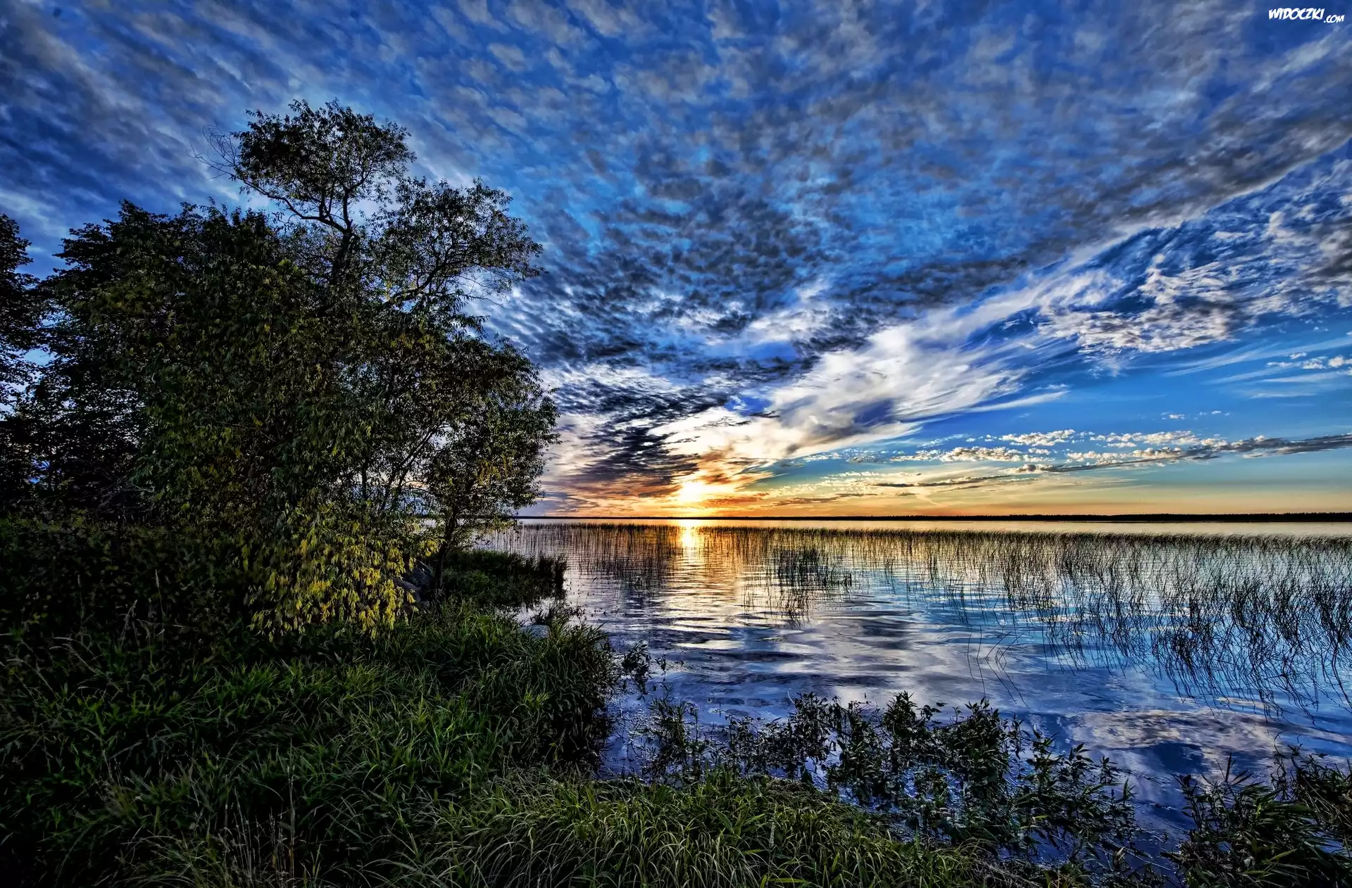 Zdjęcia, Jezioro, Wschód, Słońca, Drzewa, Niebo