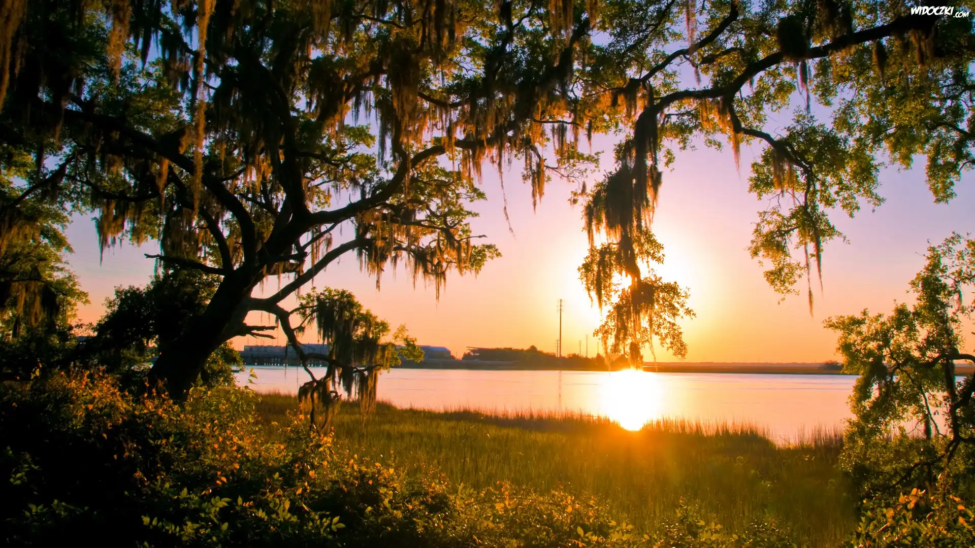 Jezioro, Wschód słońca, Drzewa, Trawy
