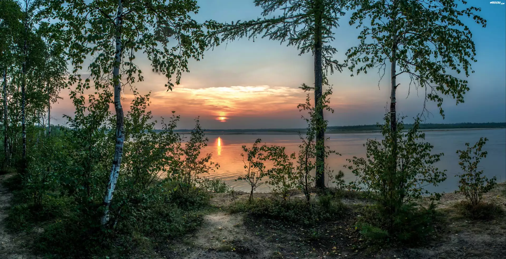 Jezioro, Zachód, Słońca, Drzewa, Brzozy