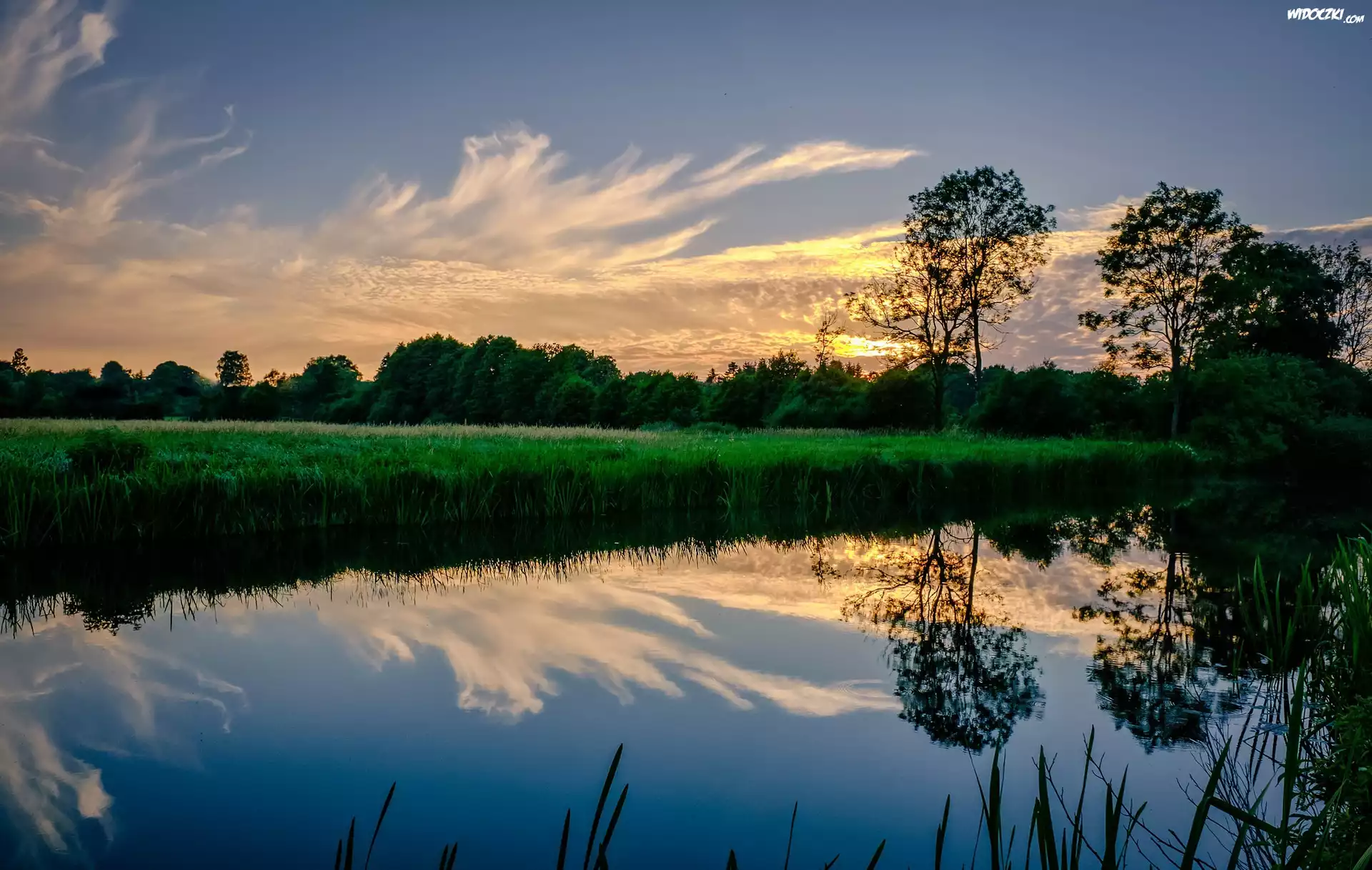 Zdjęcia, Jezioro, Zachód słońca, Drzewa, Chmury