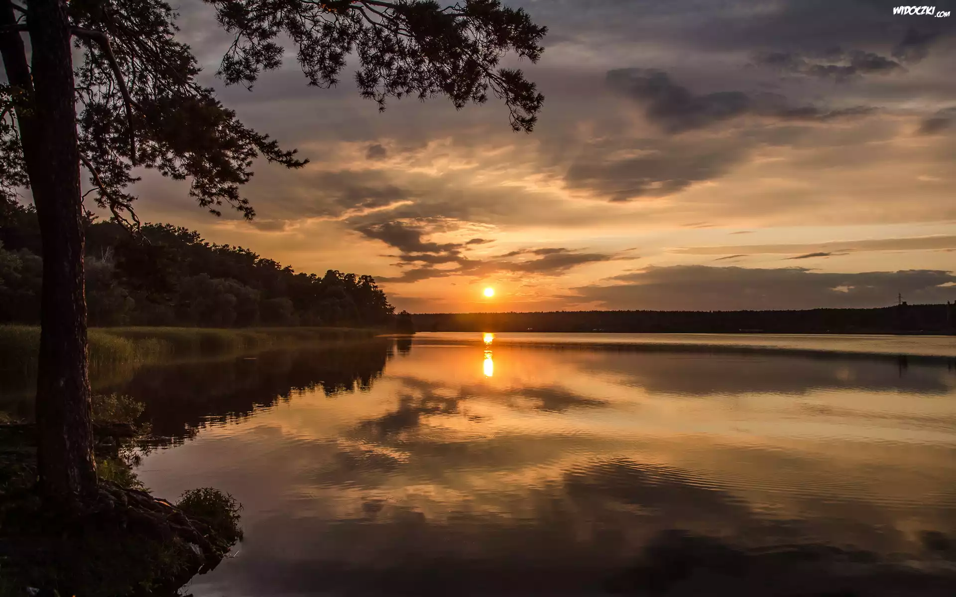 Jezioro, Zachód słońca, Drzewa, Chmury