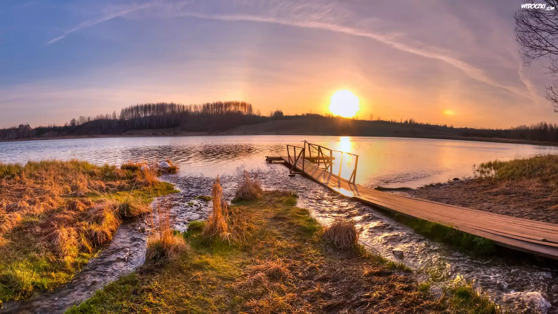 Jezioro, Zachód Słońca, Drzewa, Pomost