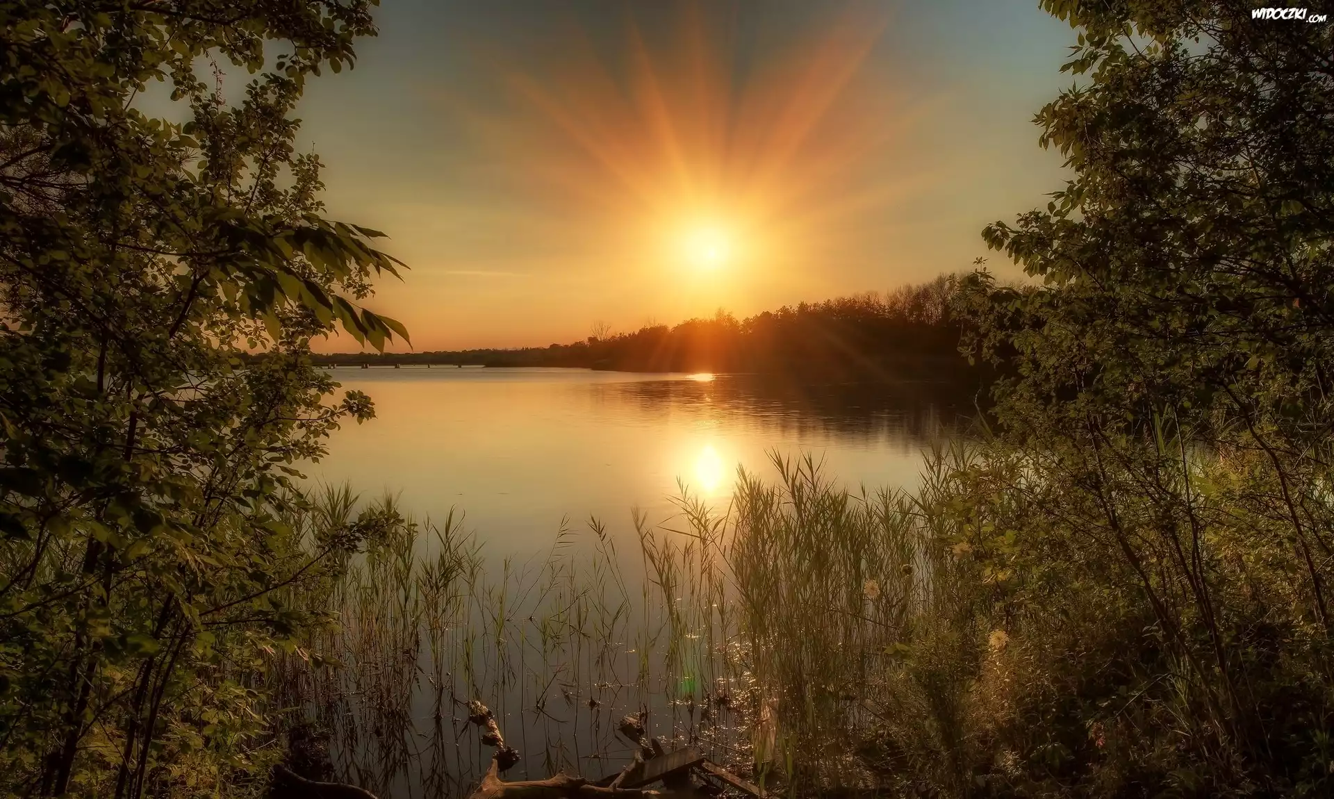 Jezioro, Zachód, Słońca, Drzewa, Trawy