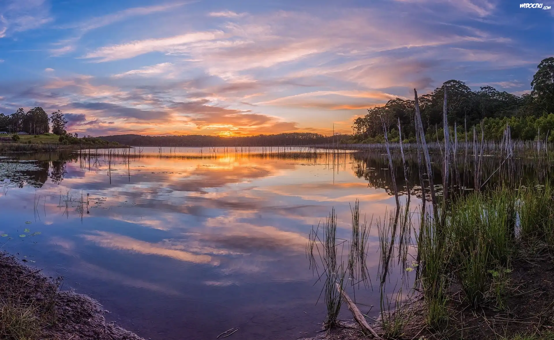 Jezioro, Zachód słońca, Drzewa, Trawy