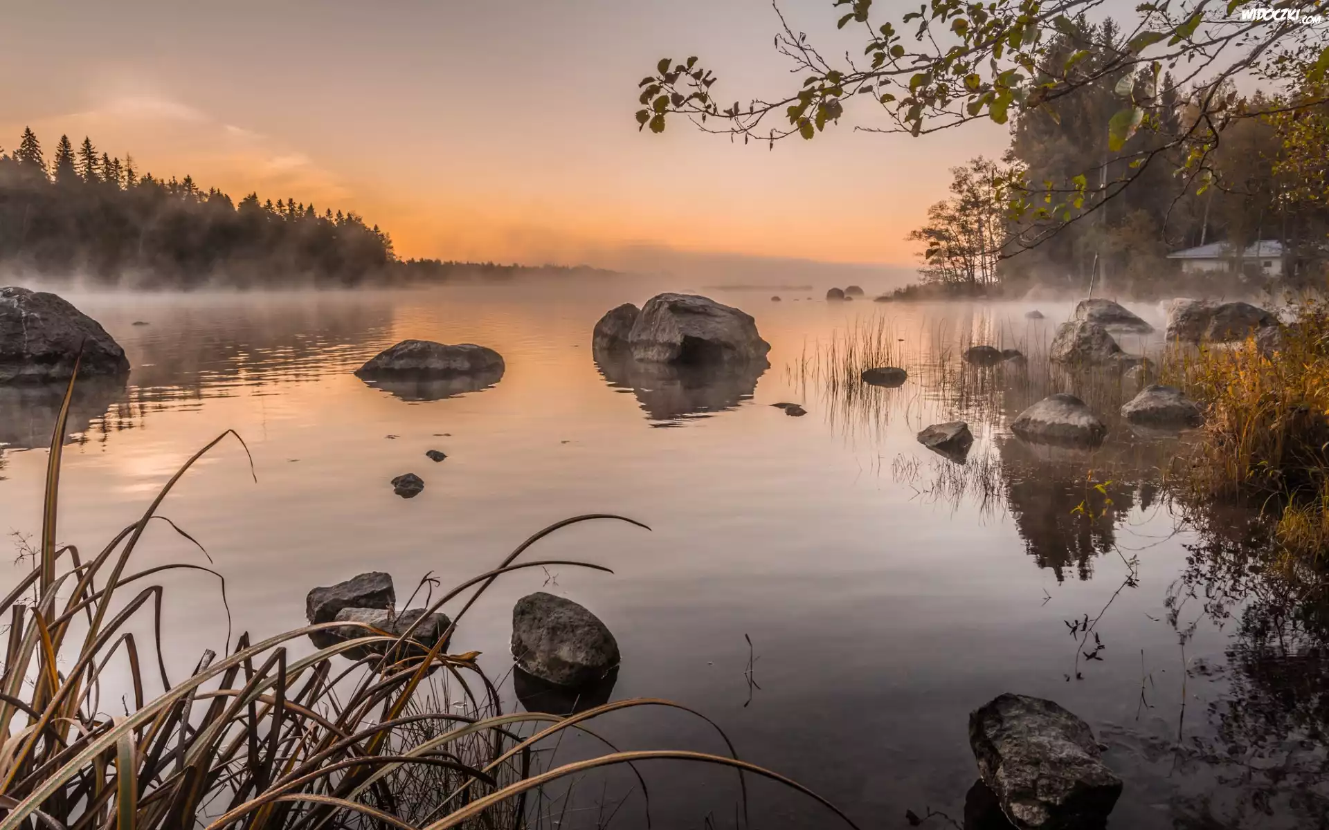 Zdjęcia, jezioro, Kamienie, Trawa, Drzewa, Mgła