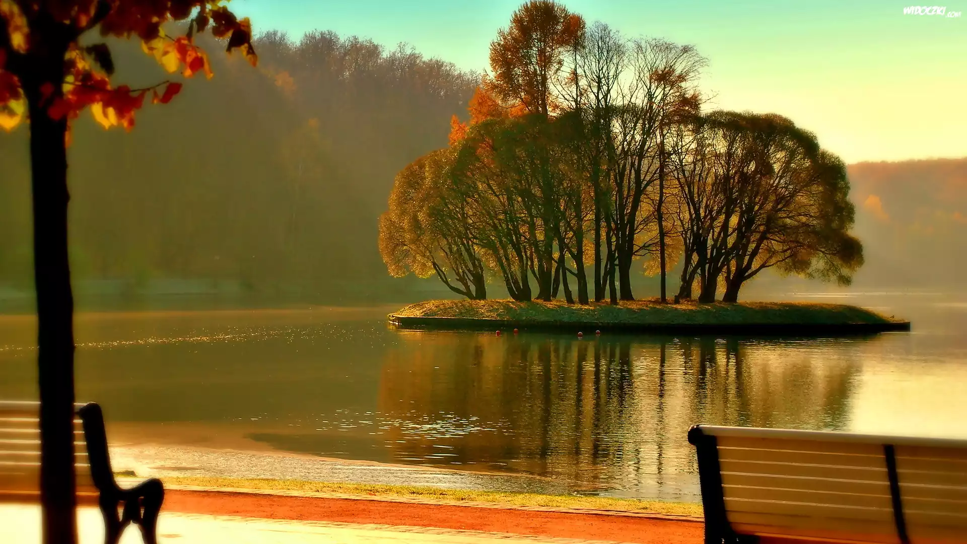 Zdjęcia, Jezioro, Mała, Wyspa, Drzewa, Ławki