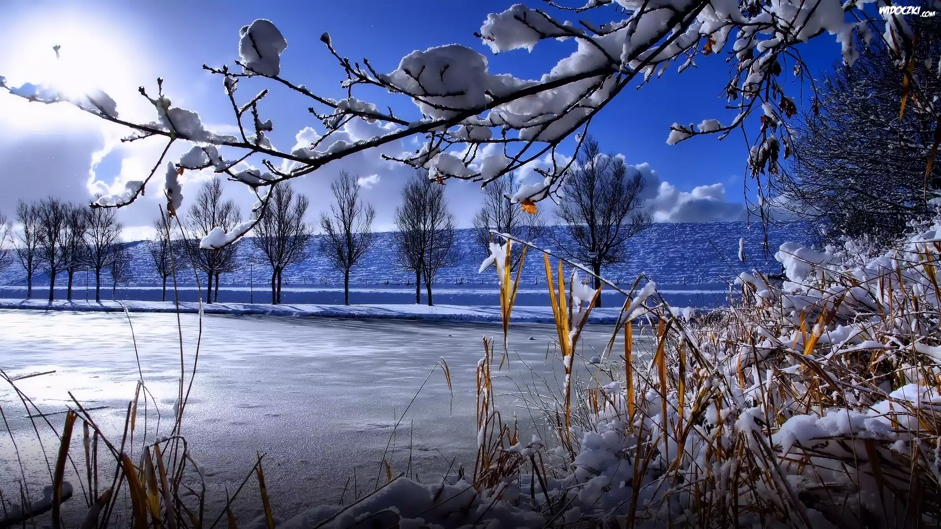 Zdjęcia, Jezioro, Zima, Drzewa, Trawy