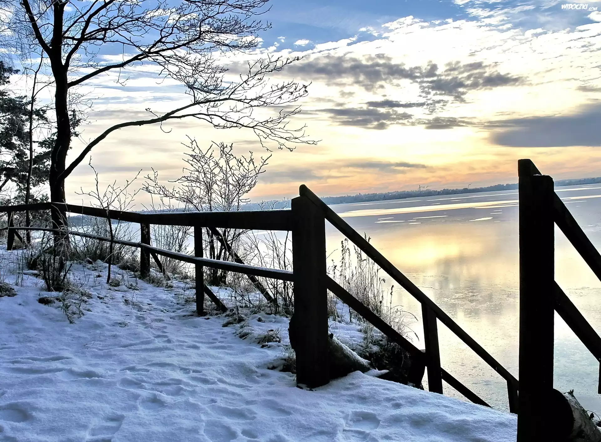 Zdjęcia, Jezioro, Ogrodzenie, Drzewo, Śnieg