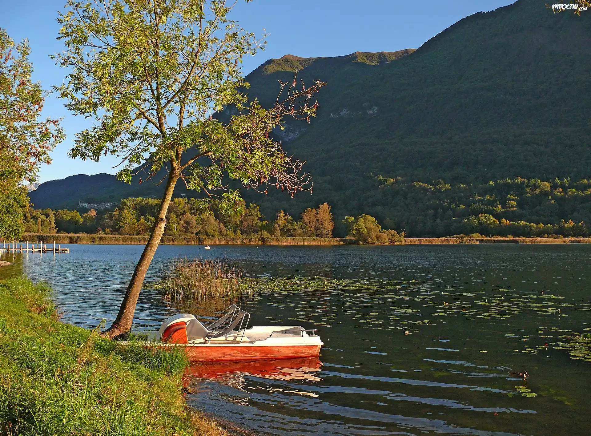 Zdjęcia, Jezioro, Rower wodny, Drzewo, Góra