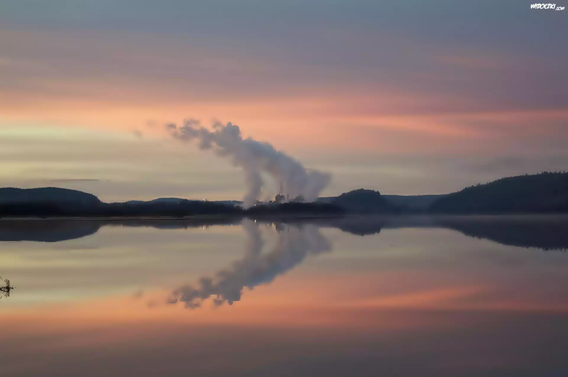 Jezioro, Góry, Fabryka, Dymy, Odbicie