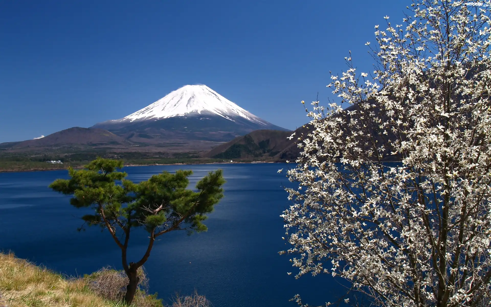 Zdjęcia, Jezioro, Kwitnące, Drzewo, Góra, Fudżi, Japonia