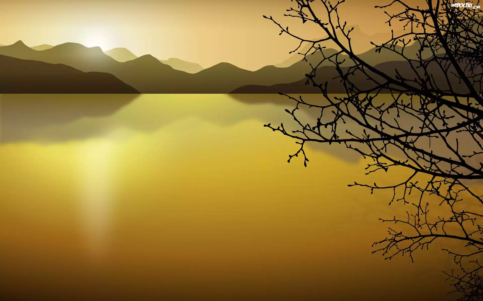 Jezioro, Blask, Gałęzie, Złoto