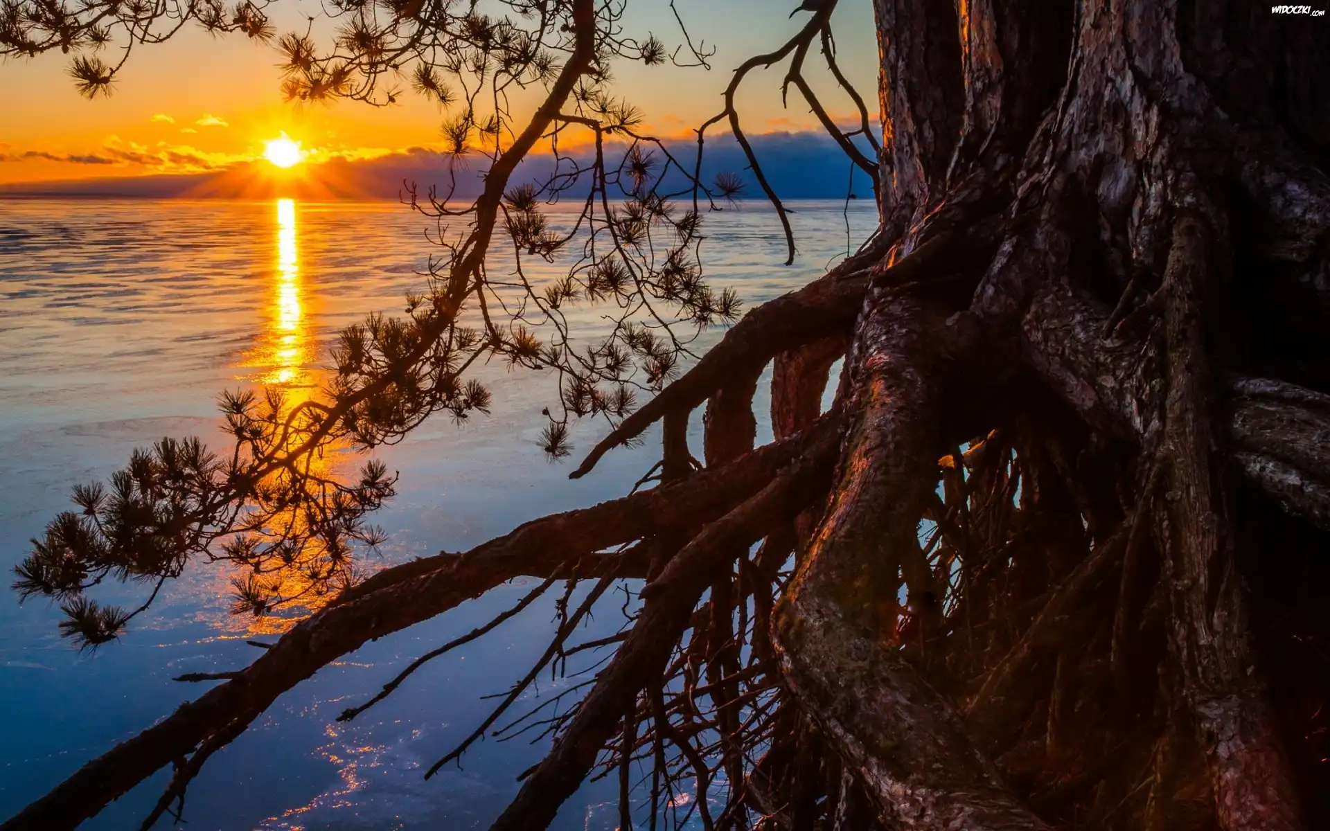 Zdjęcia, Jezioro, Zachód słońca, Drzewo, Gałęzie, Las