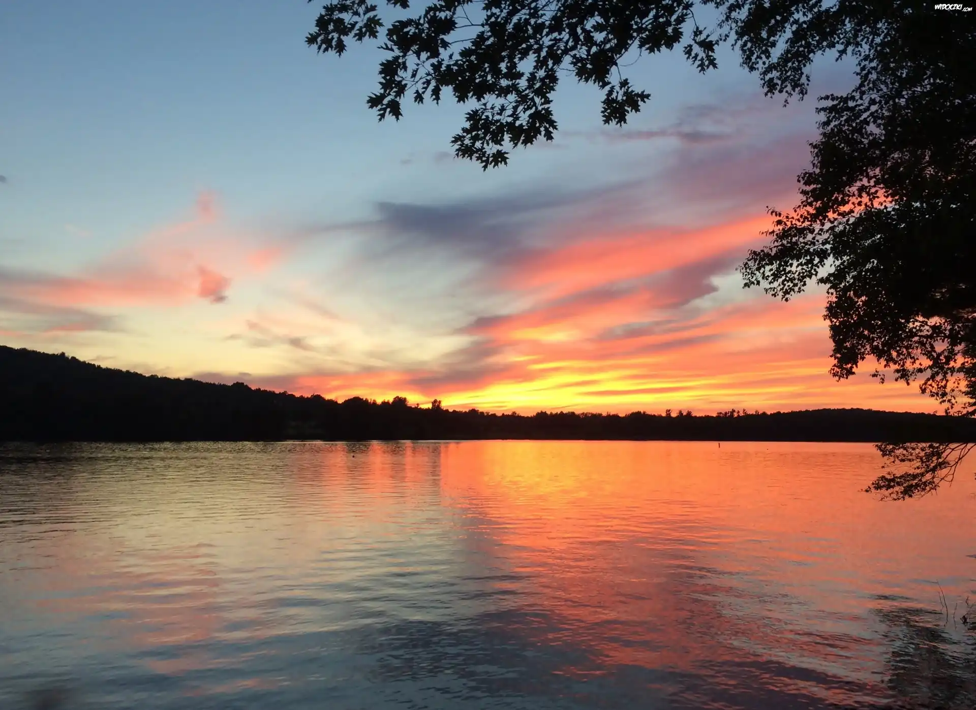 Zdjęcia, Jezioro, Zachód słońca, Las, Gałęzie drzew