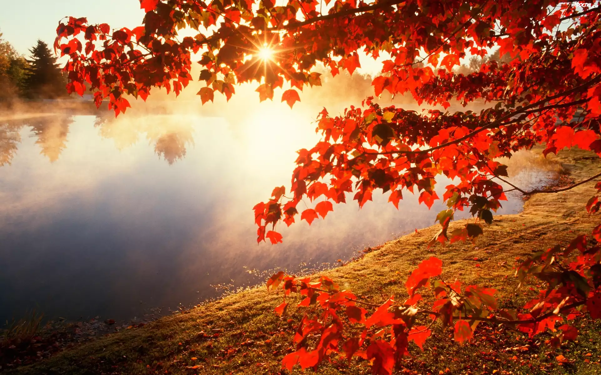 Jezioro, Promienie, Słońca, Gałęzie, Drzew