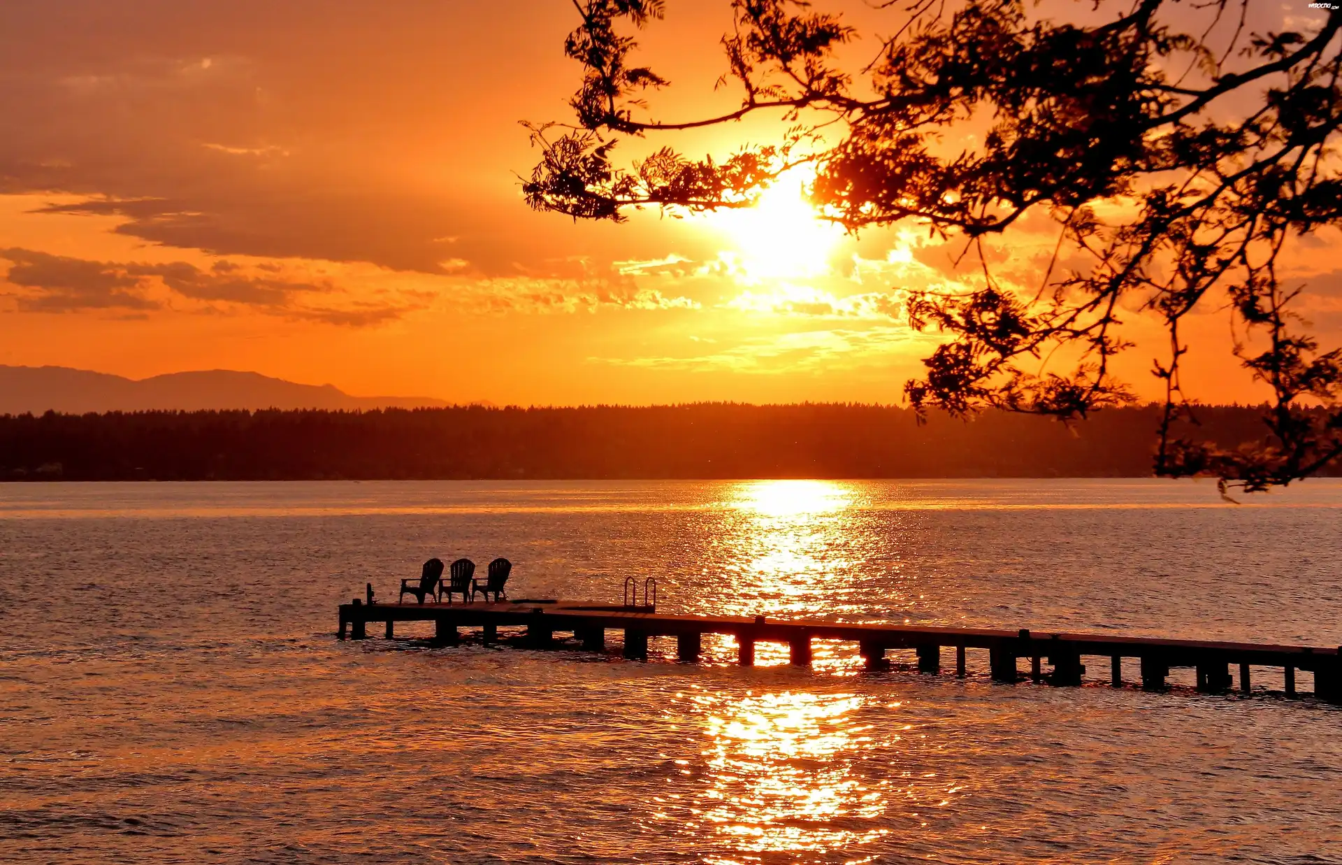 Jezioro, Zachód słońca, Gałęzie, Molo