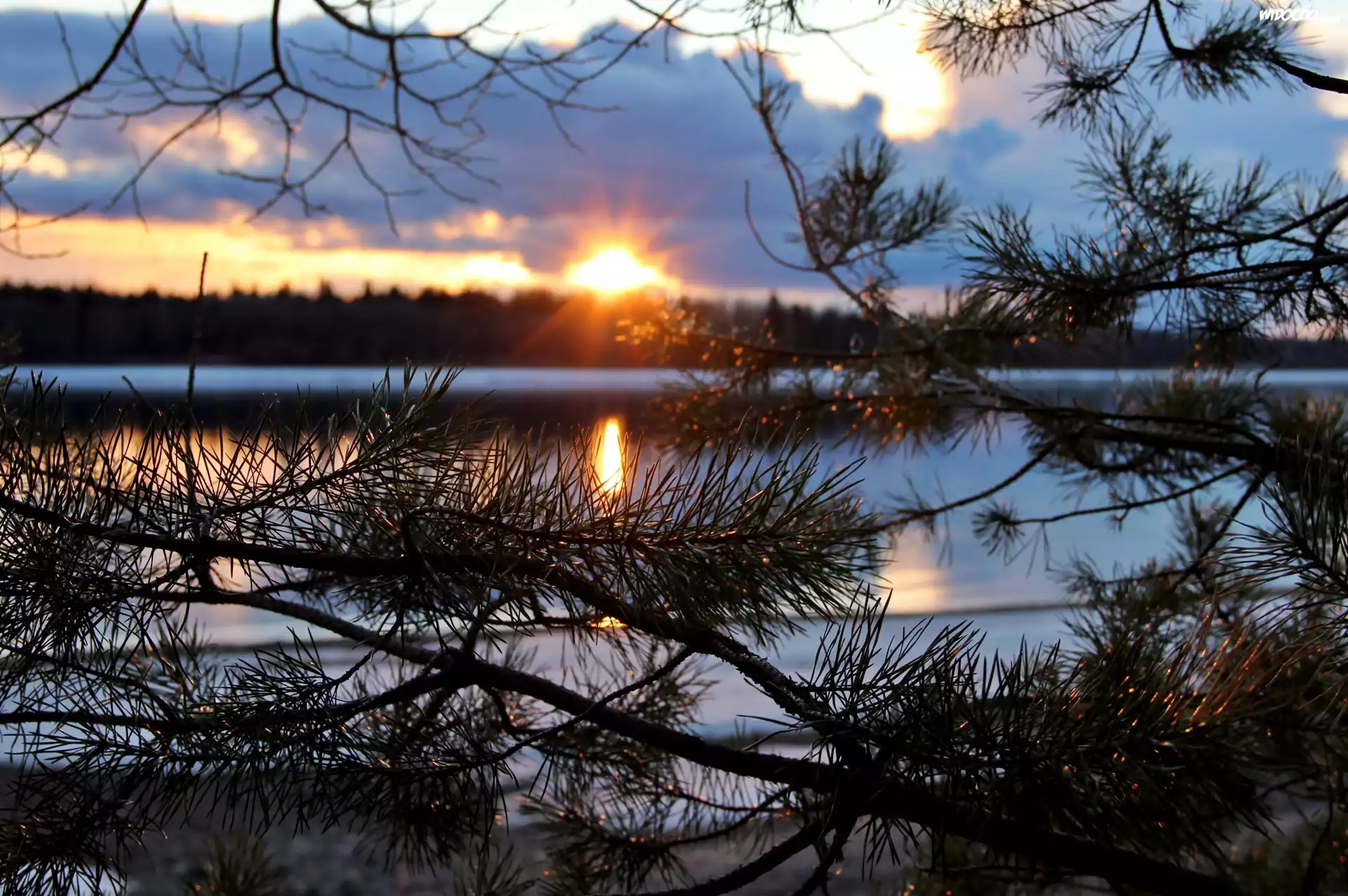Jezioro, Zachód, Słońca, Gałęzie, Sosny
