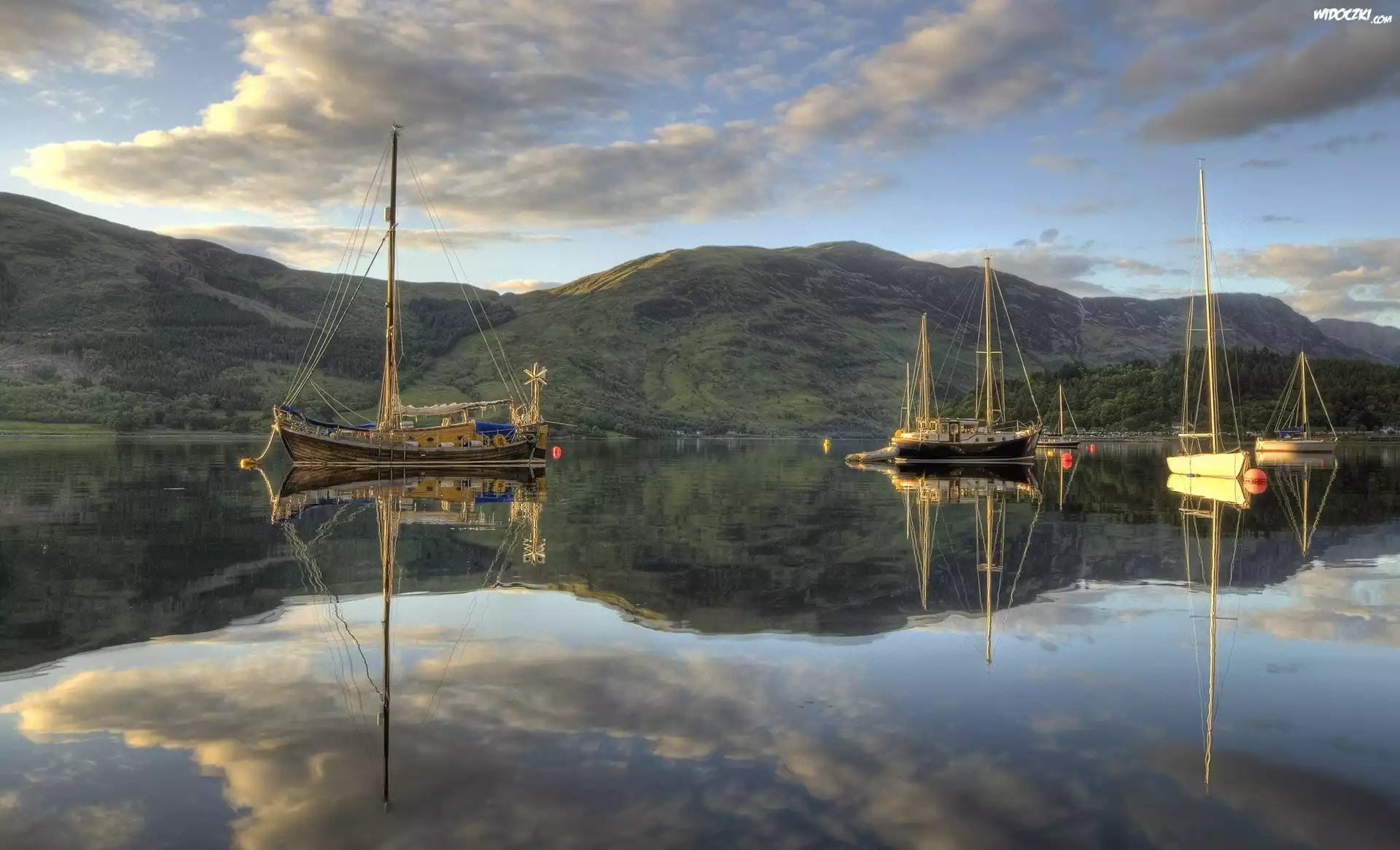 Zdjęcia, Jezioro, Żaglowce, Góry, Chmury