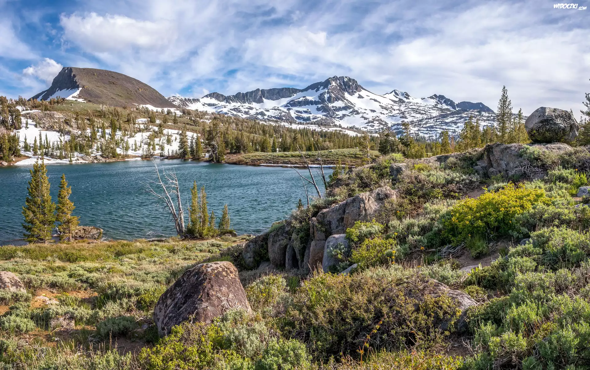 Góry, Jezioro, Skały, Kamień, Drzewa, Roślinność, Chmury