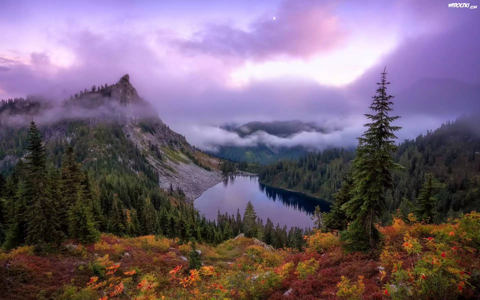 Jezioro, Lake Valhalla, Góry Kaskadowe, Drzewa, Zieleń, Mgła, Chmury, Stan Waszyngton, Stany Zjednoczone |