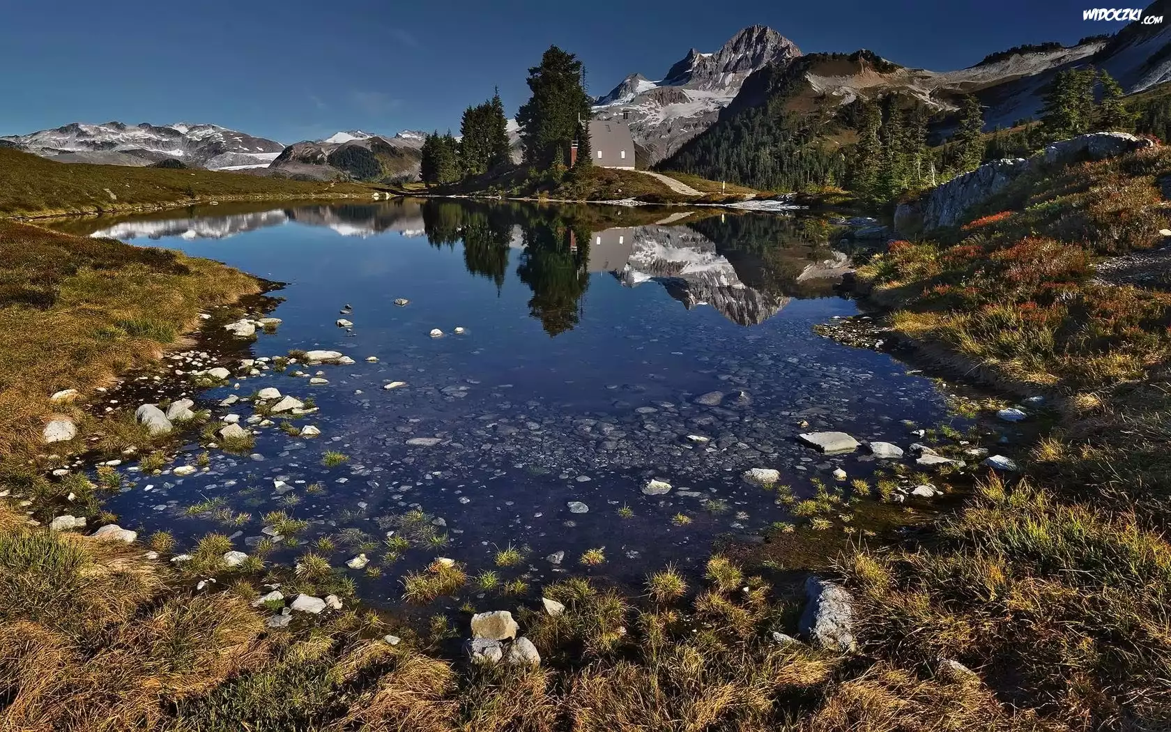 Jezioro, Drzewa, Las Zachód S³oñca, Morze, Pla¿a, Góry, Wybrze¿e