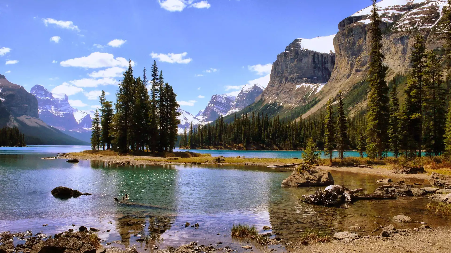 Góry, Jezioro, Drzewa, Las, Ośnieżone Szczyty, Kamienie