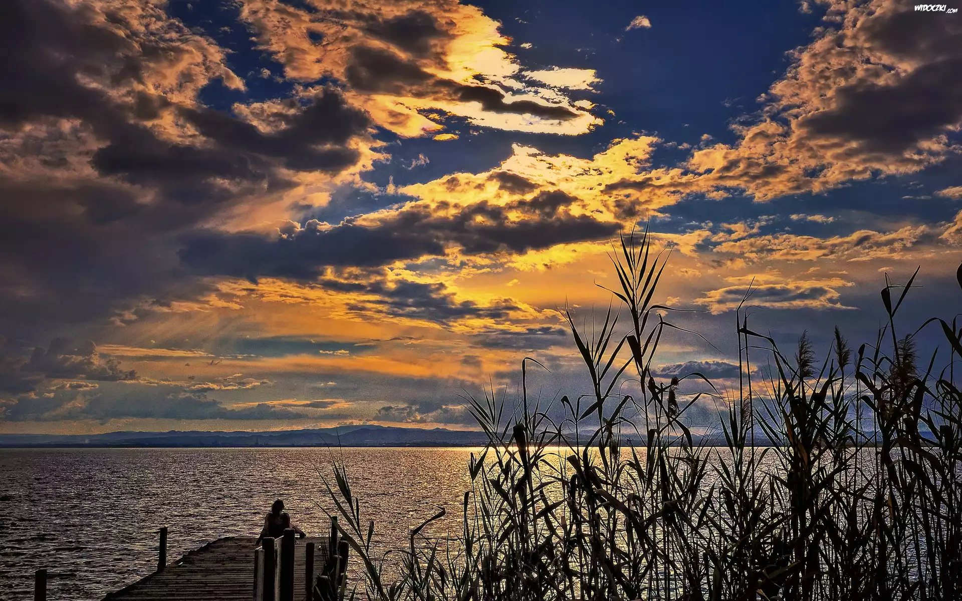 Zdjęcia, Jezioro, Pomost, Kobieta, Trawy, Góry, Chmury