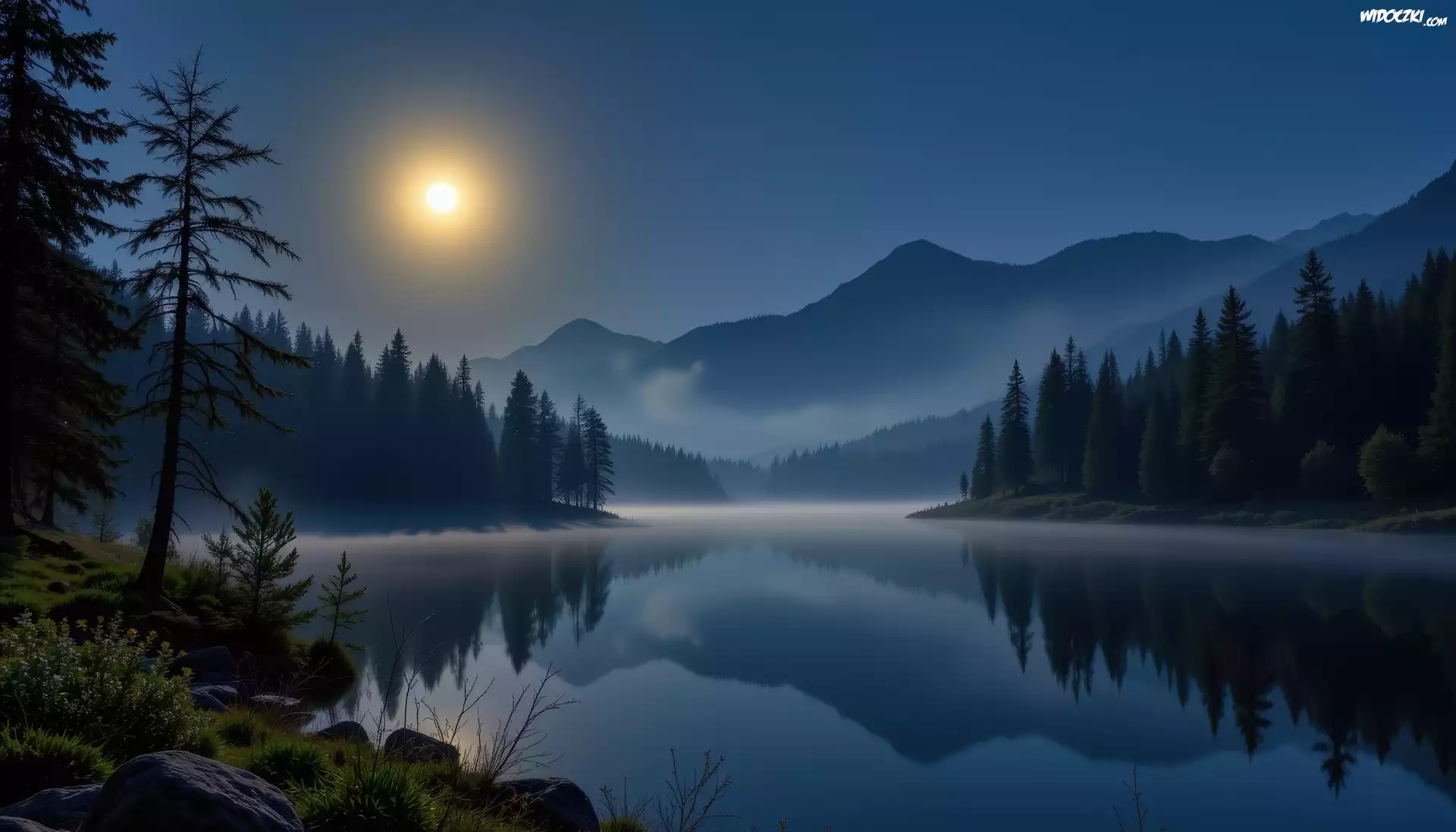 Noc, Księżyc, Góry, Jezioro, Mgła, Drzewa, AI